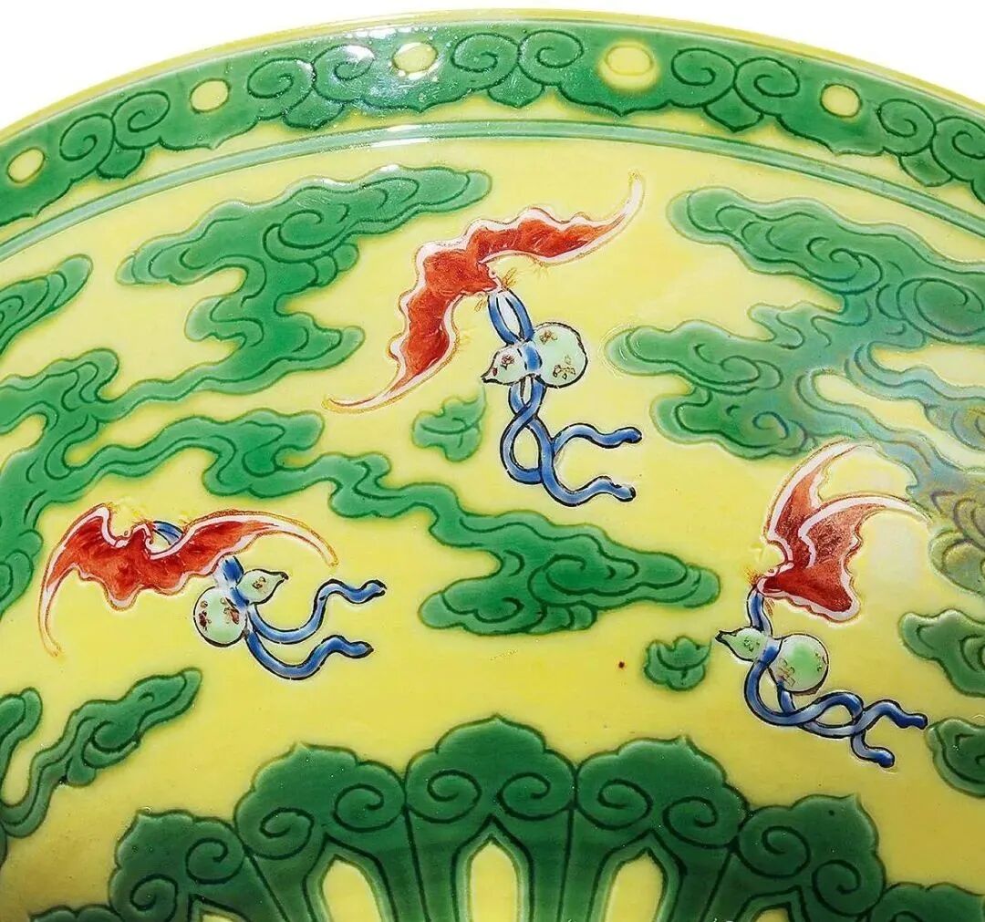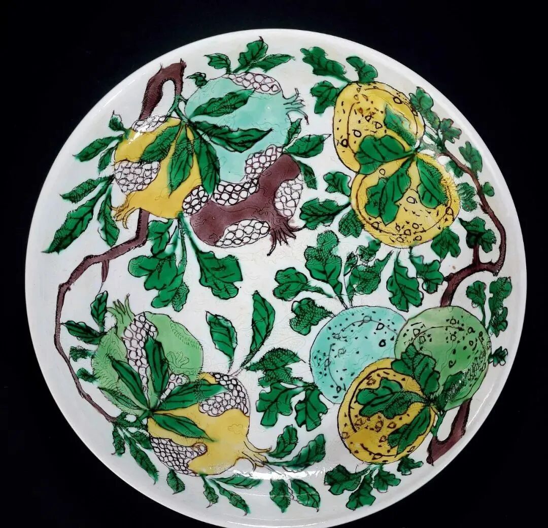 苹果绿釉是我们通俗所讲的淡绿釉,淡绿釉是雍正晚期、乾隆早期研制的新釉色,在铅黄釉中加入铜,再混入锌使釉呈不透明状态,需经低温二次烧成。因制造过程非常困难及危险,故淡绿釉器烧造时间不长,存世量不多,且传世器物多为小件,本器当属近年拍场中少见的苹果绿釉立件作品,至珍至罕。台北故宫博物院一件原定名称为「清乾隆窑松绿釉盘」的藏品,清宫旧配木盒上刻有「乾隆年制磁胎洋彩翡翠果盘」品名,命名与清宫《活计档》、《陈设文件》记载相符,其釉色与拍品相近。
