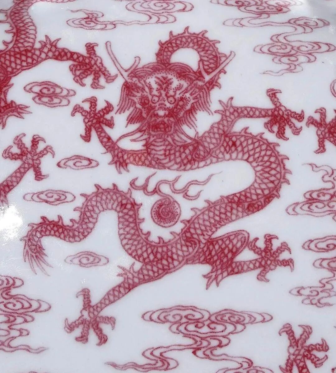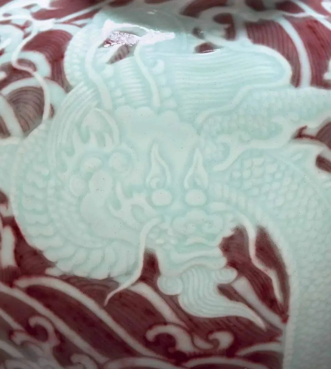 艺匠以精湛雕工,在器身剔刻通景苍龙教子图,苍龙于汹涌海水间腾跃,龙身雄健壮硕,爪牙锋利,叱咤其中,在翻腾细浪衬托下气度非凡,大有气夺千里之势。幼龙于惊涛海面中迎苍龙而起,二龙四目相对,教子之殷殷期望跃然于瓷上。整器纹饰绘制生动精美,深得迤逦之姿,江崖海水之中波涛汹涌,细节之处一丝不茍,工艺细腻而娴熟。两龙神形俱佳,栩栩如生,所饰龙纹以留白剔刻而成,龙鳞背鳍之刻画纤毫毕现,且与釉里红分界鲜明,海水则纯以釉里红绘就,线描、渲染及留白技法相结合,极具装饰效果。