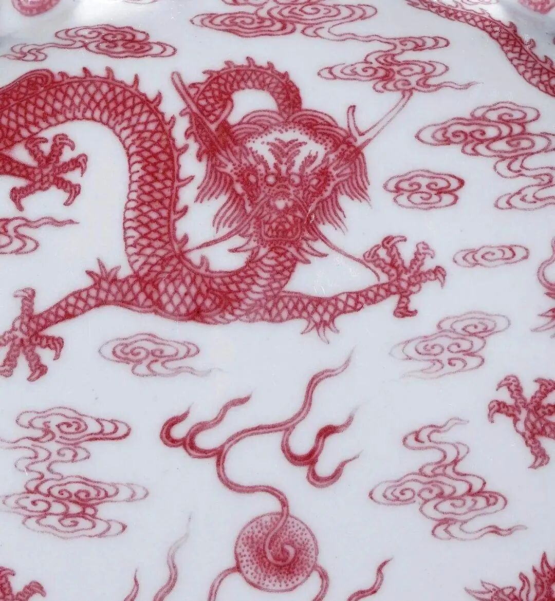 据清宫档案记载,为了达到「花纹清真,釉水肥润,颜色鲜明」的效果,乾隆皇帝专门拿出他认为发色理想的釉里红马挂瓶作为唐英烧造的标准,可见乾隆皇帝对釉里红的烧造费煞心思。所以唐英引领下的御窑厂秉承乾隆谕旨敬谨烧造,只有从以上两个方面改进和提升,而火候多赖天成,全靠经验,唯装饰分布则可人为规避,最佳方案则是以线描一法为之。所以乾隆朝釉里红器物多见以线描法绘就,本品亦然,以釉里红勾勒纹饰后加点涂法而成,不使用平涂技法。本品出色鲜妍清晰,不可不归功于乾隆皇帝的勤勉关注。据此可以推定乾隆朝以线描技法绘画的「花纹清真,釉水肥润,颜色鲜明」的釉里红御瓷应是乾隆四年之后的产品。