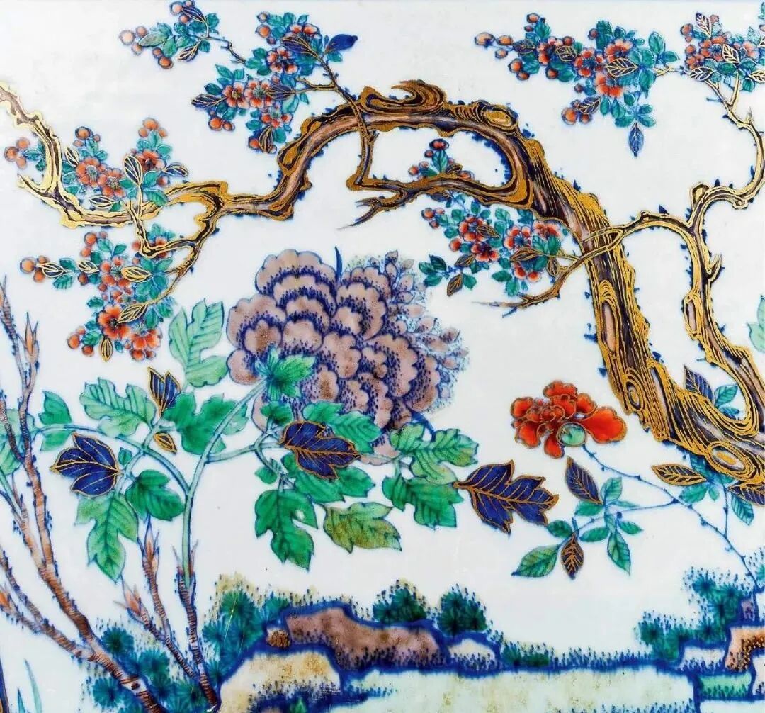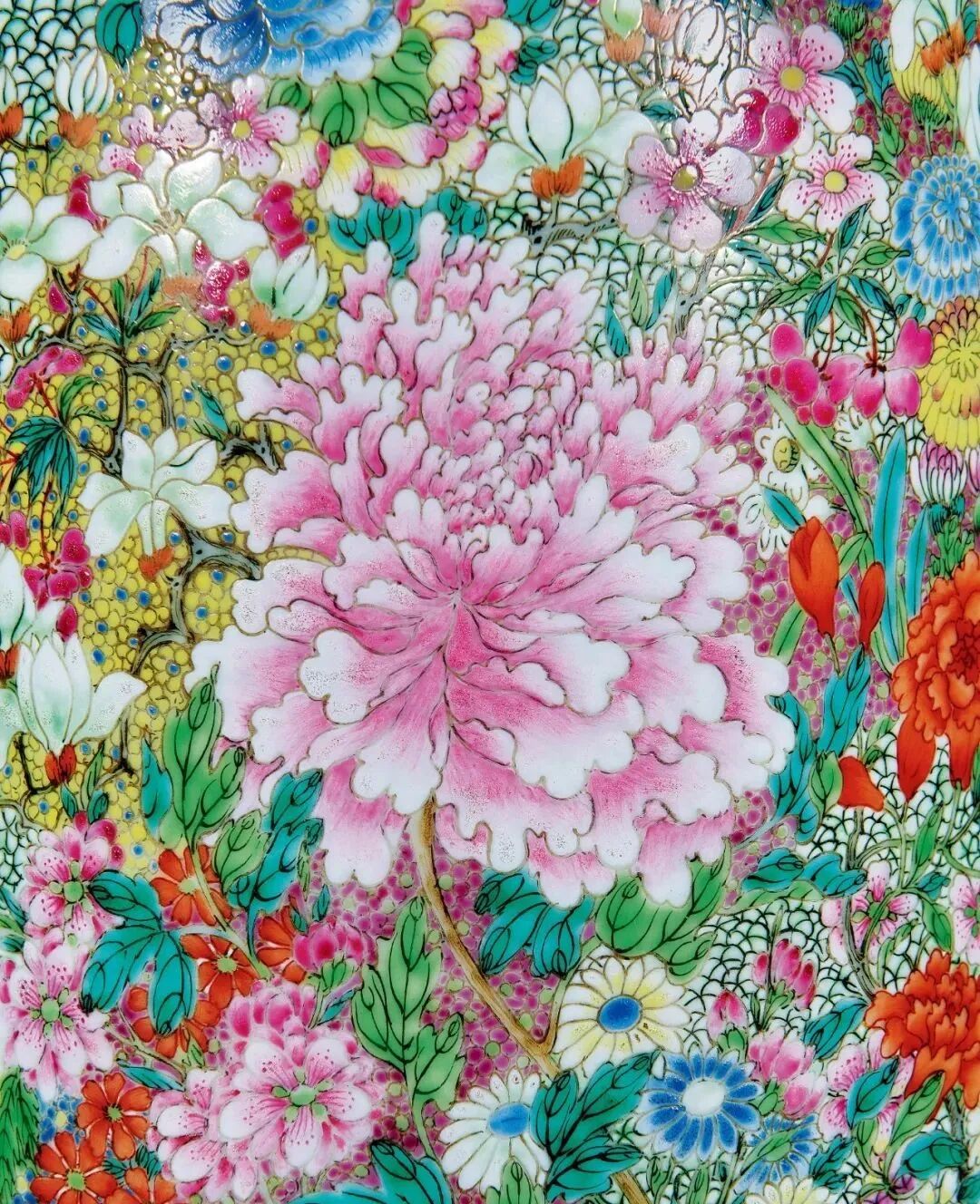百花不露地装饰工艺在绘画上受到宫廷画家工笔写实和恽南田没骨画法的影响。同时受到了当时西方皇室装饰影响;在设色及阴暗透视上又受到就职于造办处的西洋画家影响,艺匠用不同浓淡、深浅的颜色表现花朵,并运用油画画法中的阴阳向背与凹凸感使其更为鲜活,形神兼备,密而不乱,极富层次感。此种技法之出现必在工艺繁荣之世,考其源流,可知雍正一朝为初创阶段,多见碗杯之属,花叶之间留有空隙,尚无致密之象,乾隆之后发展至极致,嘉庆初年尚见,本品即为典范。其工序之繁缛,设色之丰富,绘画之多彩,绝非数人之力可成,当为彩瓷之翘首。本瓶虽落嘉庆款识,仍可看作是乾隆朝瓷匠的延续之作,其艺术价值不输乾隆本朝。