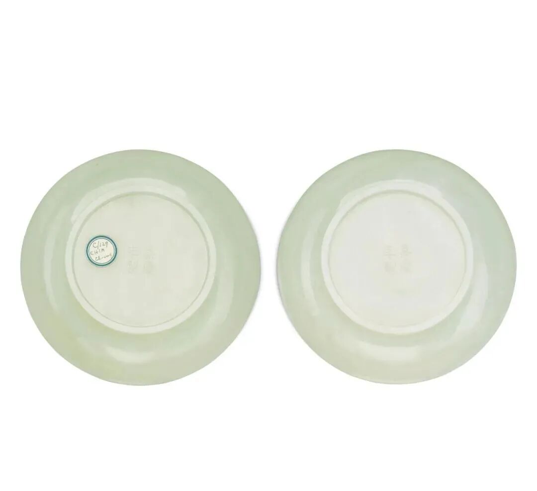 每个雕刻有低圆边上升到一个轻微的喇叭口边缘,底部刻有四字标记,石头是非常淡的青瓷白色调