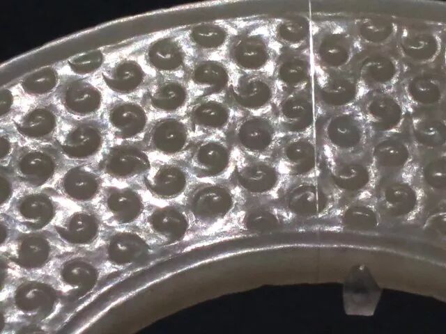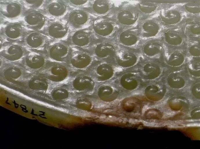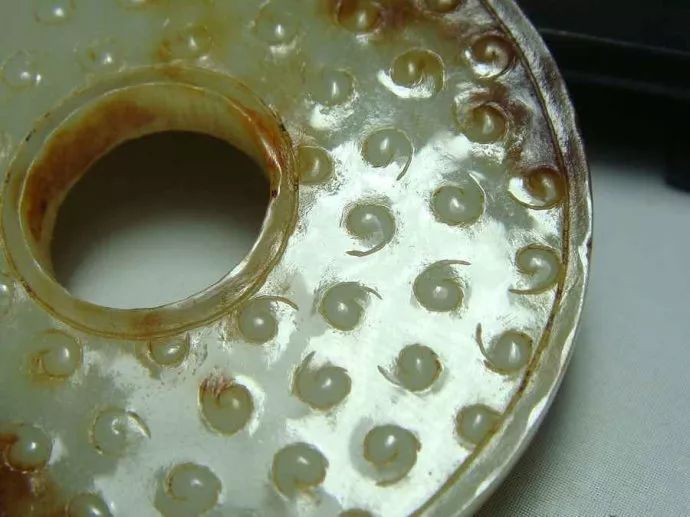 四、大家从图三、五、六这三张图片可以看到谷纹的排列和谷纹底部的特征。古代玉匠加工谷纹时,往往先在素璧上打出蒲格,再剔地加工出谷纹。因剔地加工的关系,谷纹的底部是起伏不平的,加工出的谷纹如镶嵌在玉璧之上,而现在做假的谷纹,往往底部水平,一般为合模或机雕或超声波震荡而成。