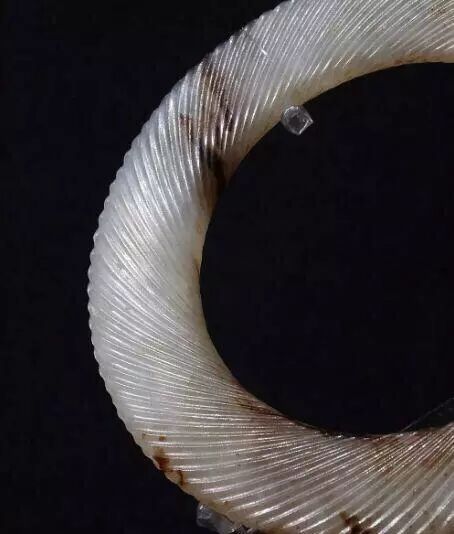 合模加工直接成型的,谷纹底部与平面夹角处会出现气泡,也有的会成型后进行手工加工修饰。机雕加工的谷纹,阴线无砣痕,宽窄、深浅完全一致,在谷纹底部会出现完全平行的水波纹,且多数做假者会在表面做上假灰皮,把水波纹盖住。大家在遇到这两种现象的谷纹玉璧,一定要擦亮眼睛。