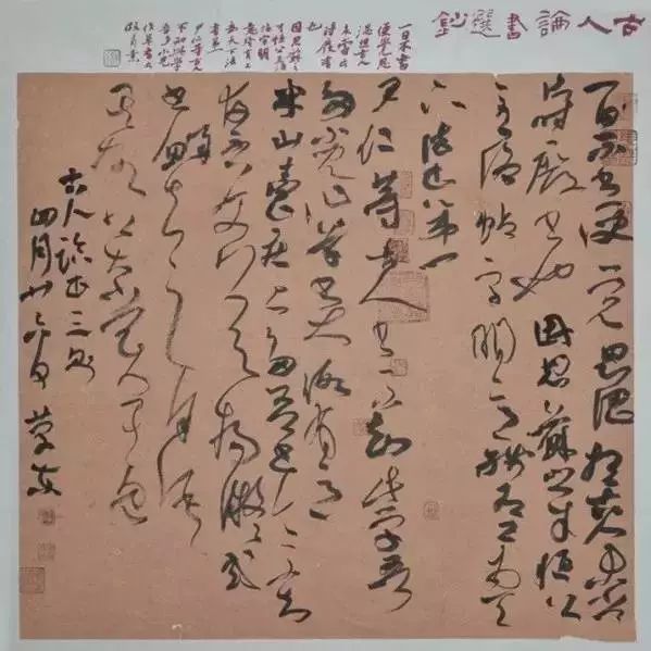 古代法帖墨迹、拓片流传至今,鉴赏、收藏者众多,在法帖中留下的题跋、印章,给作品增添了一番意趣。依此创作斗方,其主体内容还可以借用其它种类的幅式,再加上跋文、印章。由于书写内容及印章数量较多,要注意整体气息的和谐统一。