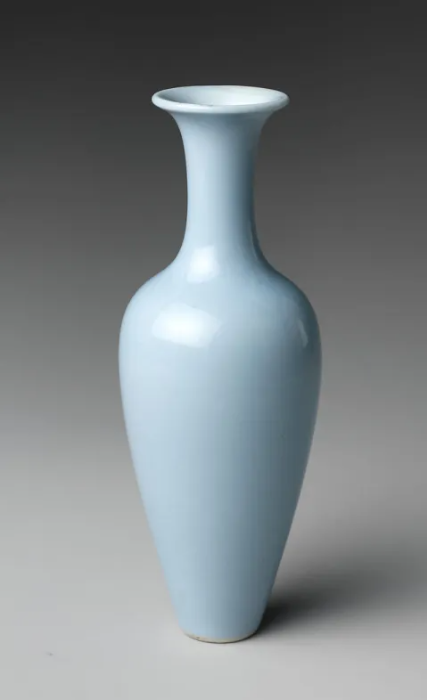 柳叶瓶是传统经典的一种陈设花瓶,整体姿态修长,形状酷似柳叶,因此称为“柳叶瓶”。整器线条流畅优美,釉层光亮,形体颀长,风格含蓄秀美,如少女亭亭玉立,所以又称“美人肩”。