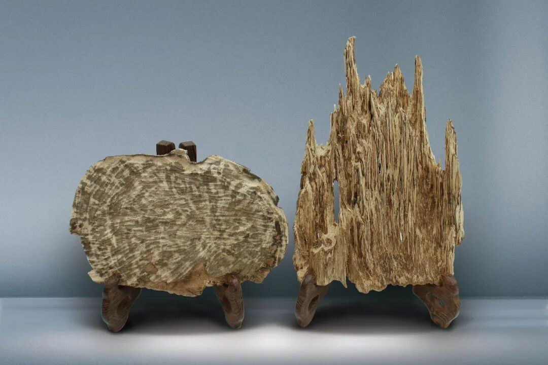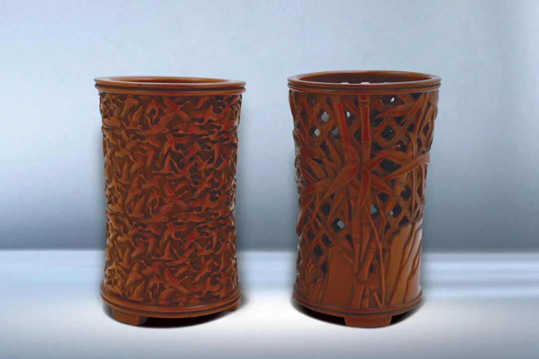 203 清 黃楊木鶴紋筆筒、竹紋筆筒二件