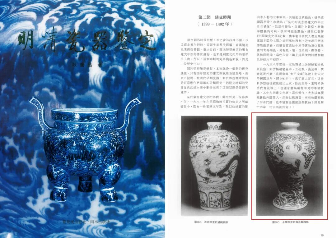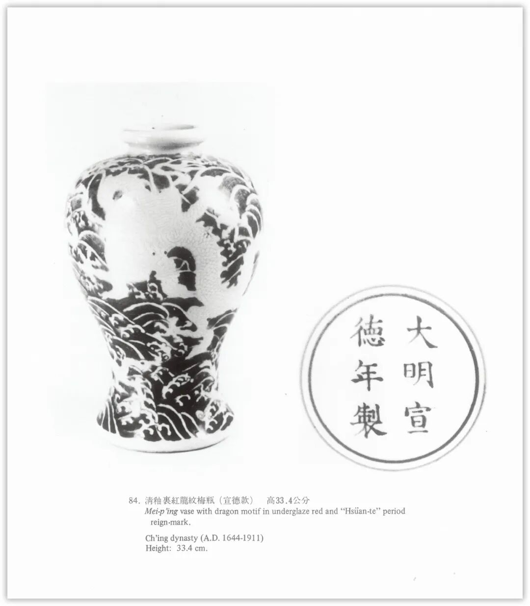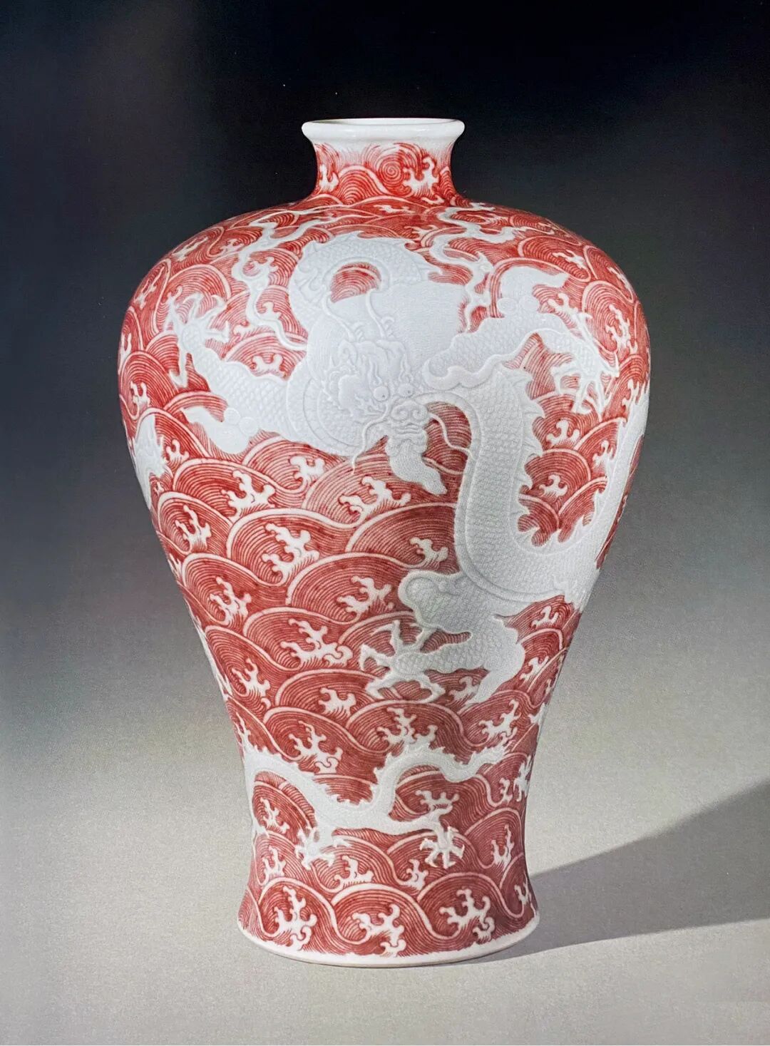查阅资料得知,国内外馆藏中,仍可见到数件康雍时期景德镇御窑追慕永乐釉里红海水龙纹梅瓶的作品传世,其中台北故宫博物院藏有一件,北京颐和园藏有两件,所饰龙纹双眼皆以青花点染,别具特色,外底青花双圈内书“大明宣德年制”六字楷书伪托款;此外,故宫博物院、纽约大都会艺术博物馆、旧金山亚洲艺术博物馆、香港望星楼及瑞士鲍尔基金会皆藏有雍正作品,可资比较研究。
