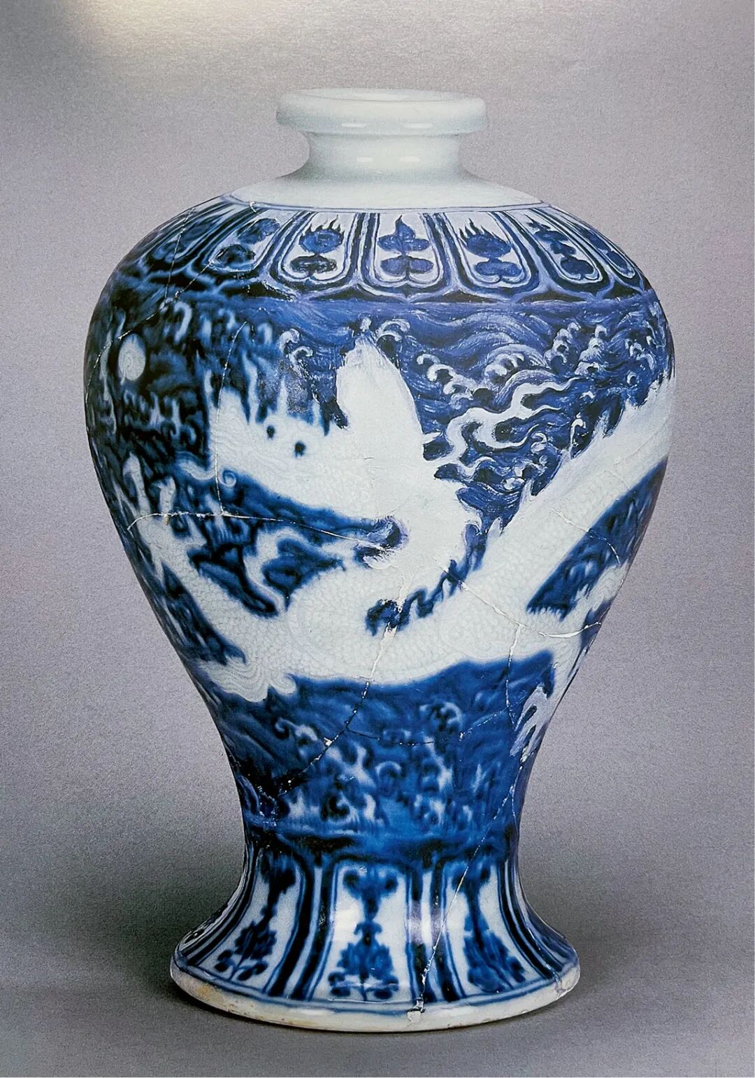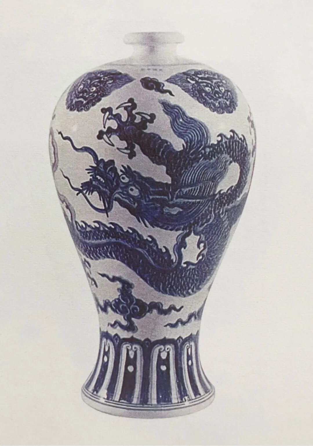 传统所见明代梅瓶肩部丰满圆润,而本品造型独特,腹部和元代相比更加开阔稳重,收腰纤细,足部外撇,此式造型在永乐时期所制梅瓶中也十分鲜见。其造型端庄稳重,龙纹锥刻而出,使其纹饰更加刚劲有张力,气势非凡。