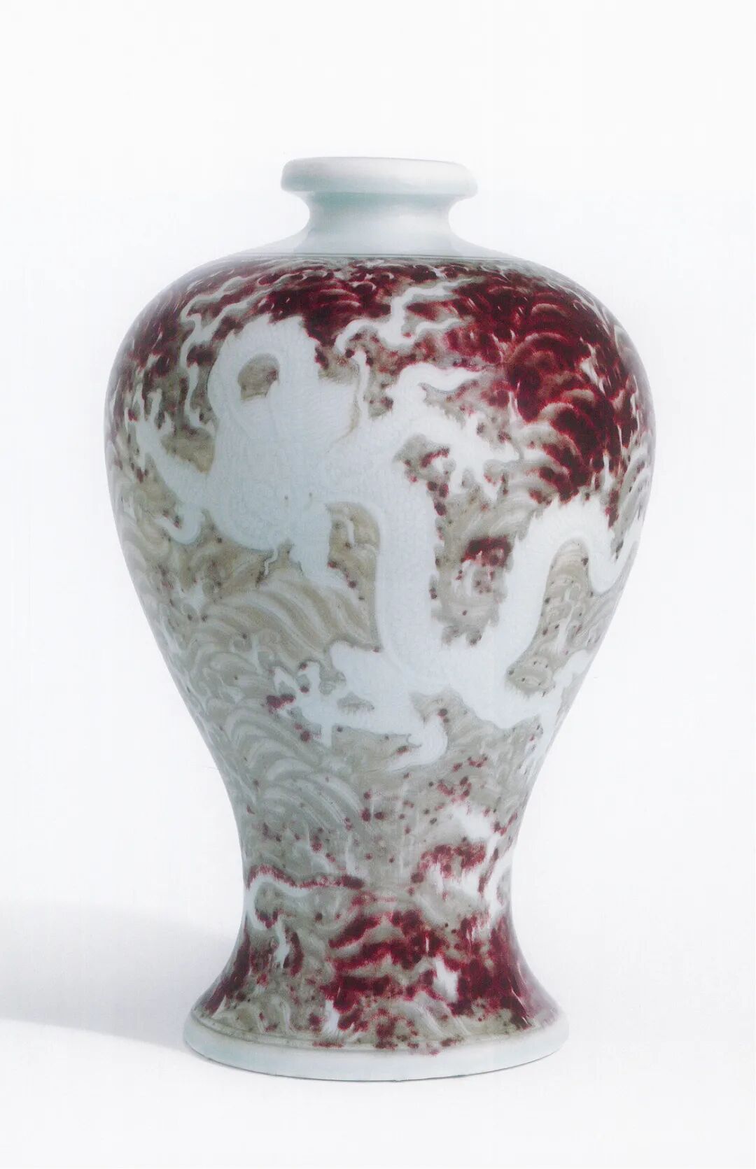 本品唇口,短颈,丰肩敛腹,胫部收束,至足部外撇,平底。造型端庄秀丽,线条优美,亭亭玉立。值得一提的是,其底部紫光下可见带有西方书写风格的藏品编号,因流传甚久,加之底部平坦,而笔墨淡化。但从书写风格推测,其早期当为欧美私人或某一收藏机构之旧藏。瓶通体施透明釉,釉面清润厚腴,如脂似玉,宛如隐青呈色,颇具时代特点。釉下以釉里红兼锥拱技法满饰苍龙教子图。画面中海水汹涌,细浪翻腾,海面见两条锥拱苍龙,硕首虬身,怒目圆睁,利爪怒张,顾首回盼身下小龙,气势极为凌人。胫部锥拱两条小龙,身形修长,与苍龙相顾盼,四目相对,呈顺应之势,表现出对苍龙之尊崇。所饰龙纹以留白锥拱而成,髭须胡髯,龙鳞背鳍之刻画纤毫毕现,且与釉里红分界鲜明,凸显了其尊贵的主体地位。海水则纯以釉里红绘就,线描、渲染及留白技法相结合,极具装饰效果。苍龙教子图诞生于明代永乐时期,其虽为瓷器装饰纹样,但却饱含了永乐皇帝对于储君朱高炽的殷切期望。