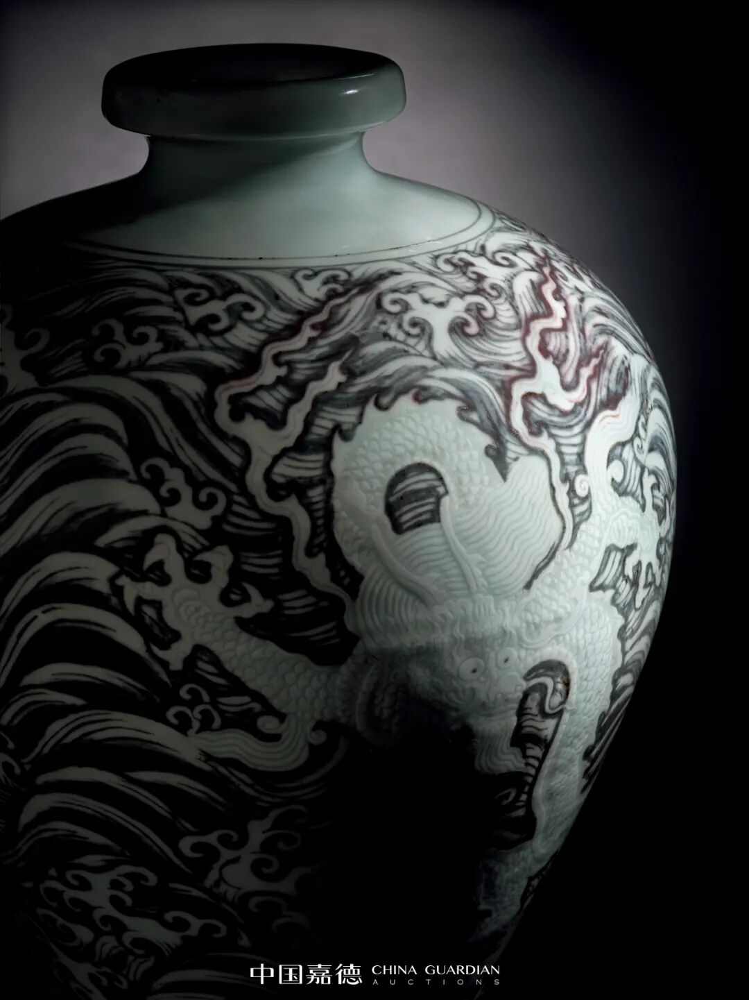 此件永乐釉里红海水锥拱苍龙教子图大梅瓶举世罕见,图案精彩绝伦,整体气势磅礴,具有强烈的艺术感染力和视觉冲击力,堪称瓷中瑰宝,彰显出大明永乐王朝之雄浑气势。这件器物超出了常人对永乐器物的一般认知水平,因此具有极高的收藏和学术研究价值。