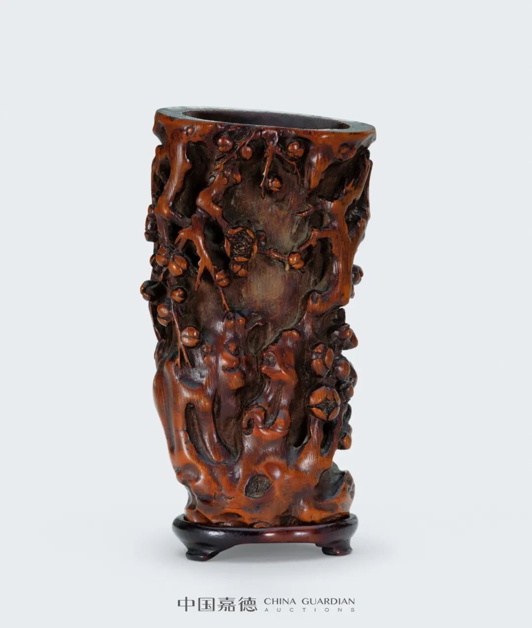 明清两代,竹以纹理细腻,软硬适刀,在表现图案细节处游刃有余而着称,故为世人所推崇。花插为竹根所制,形制精巧,在保持其原始木材形态的基础上,雕刻梅枝数枝虬结盘曲,节疤密布,别具意趣,为文人追求高洁坚韧之意。
