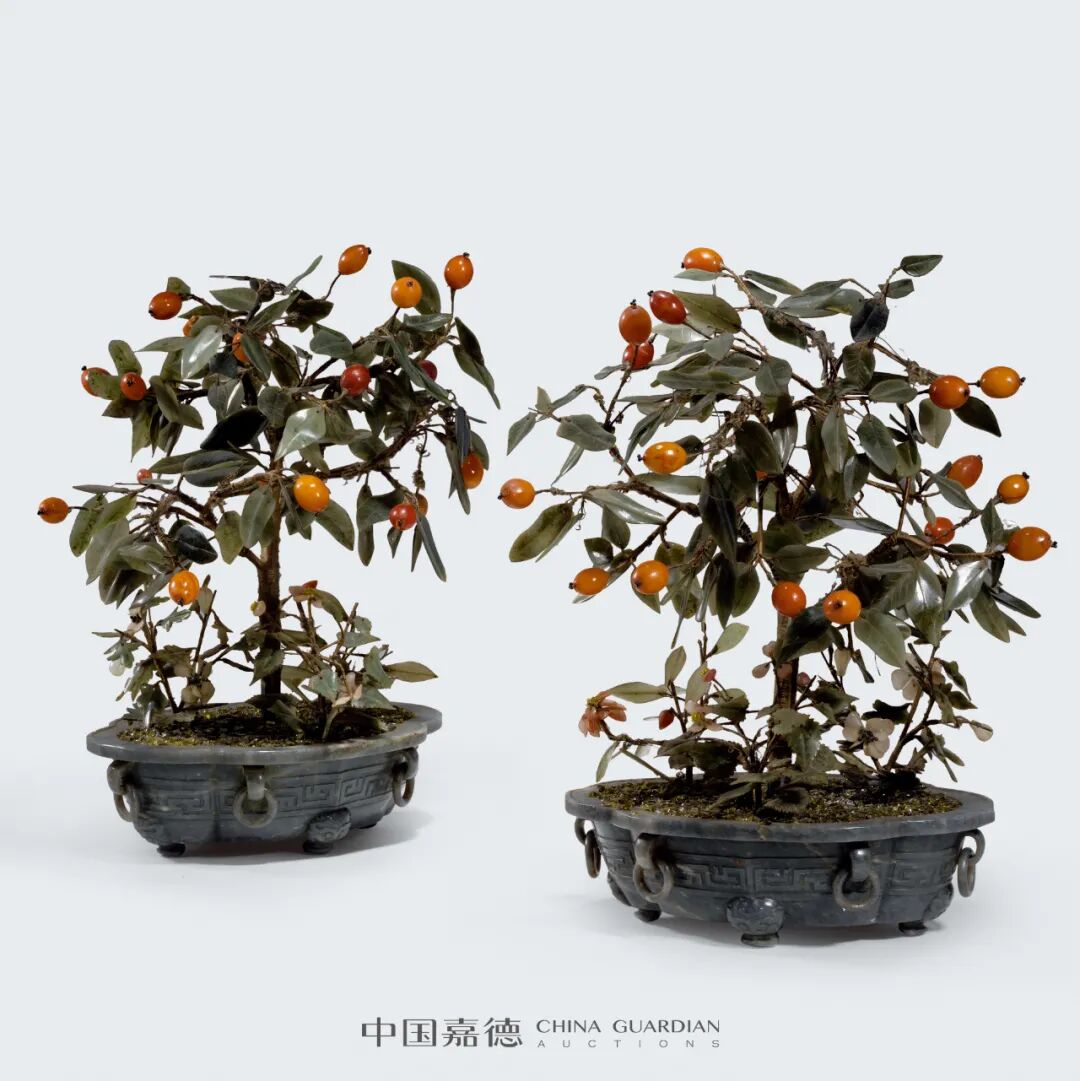 仿生盆景一对,以海棠花式黑白玉盆为盛器,盆内沃壤中植栽茂密果树,枝繁叶茂,果实圆润饱满,寄寓“丰实长寿”吉祥佳语。此种盆景置于四季寒暑分明的北方,可保花果草木永远鲜艳欲滴,绚烂夺目,更能衬托宫廷的富丽堂皇,也被寄予“万代长春”的厚望,不仅是宫廷中贵重摆设,其景致题材的寓意更使之成为帝后贵族间赏赐及馈赠佳礼。