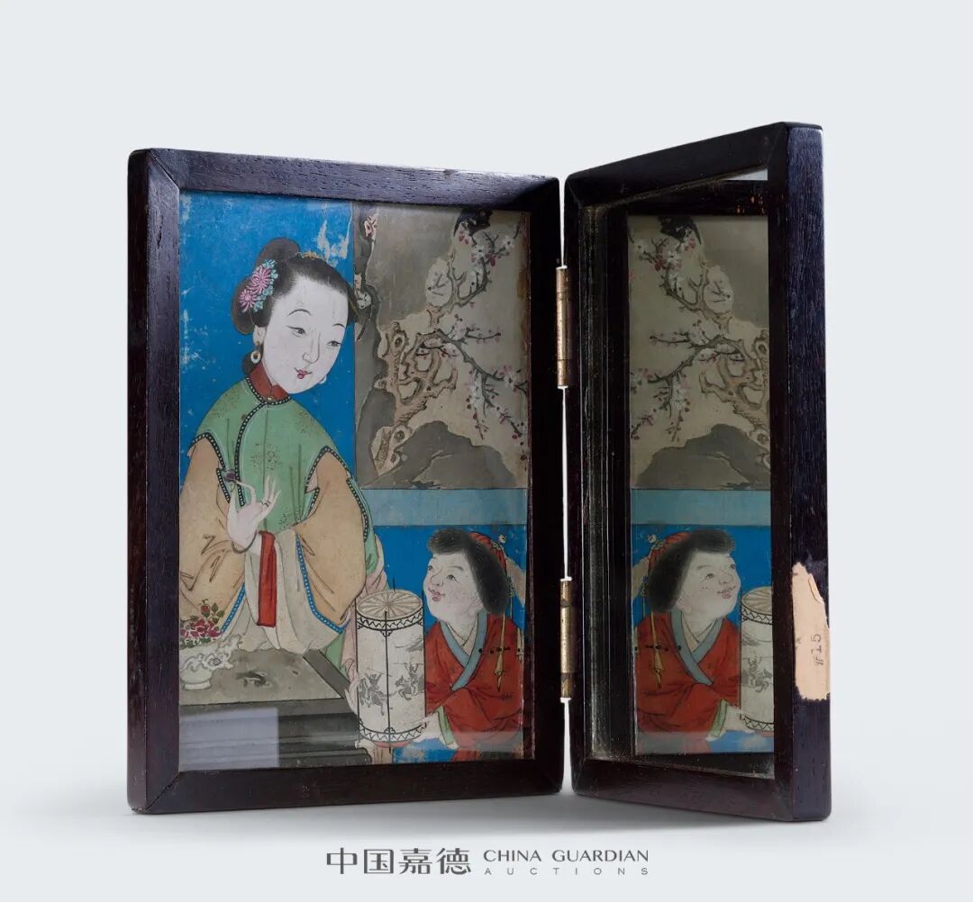此镜构思独特,两块紫檀框组合,正面镶嵌檀香木,边饰回纹,开光内浮雕花蝶纹,纹饰华丽,雕刻流畅,“蝶”谐音“耋”,取八旬长寿之意。菊蝶相映,构成一派延年益寿、生气勃勃的景象。翻开内部一面嵌玻璃镜子,一面玻璃嵌彩绘宫廷仕女童子图案,自然协调,形制独特,人物呼应自然,色彩艳丽。