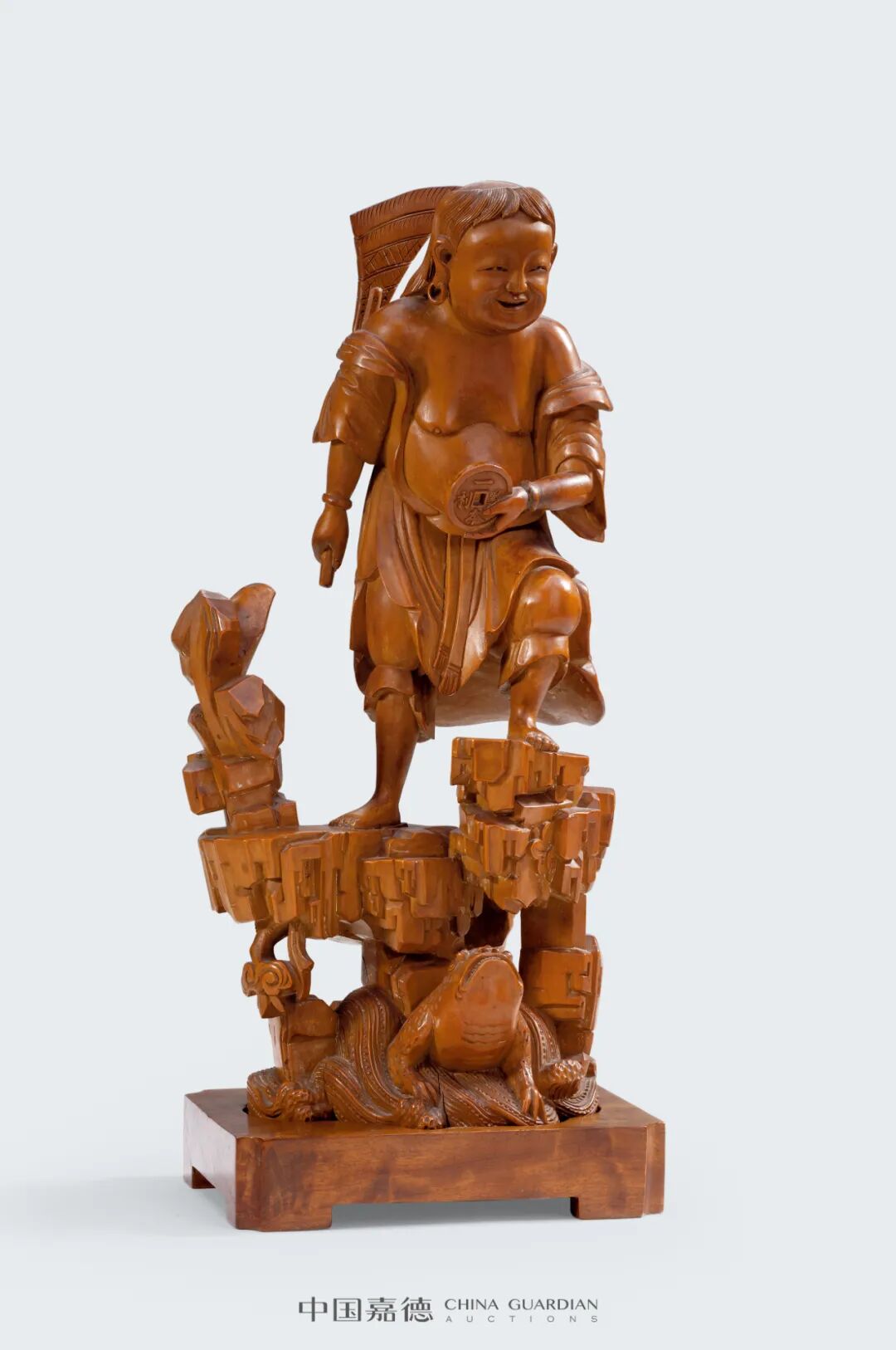 此尊刘海戏金蟾像,通身以黄杨木圆雕而成,人物外表包浆自然,光泽莹润。刘海圆脸大耳,笑逐颜开,情态可掬,披发垂肩,身披长衫,袒胸露乳,虽衣冠不修,却予人亲切随和之感。整体造型天真浪漫,洋溢着欢乐融融的喜庆气象,颇有意趣。服饰衣褶线条流畅自然,刀法娴熟,可谓一气呵成,是清代木雕中少见精品。