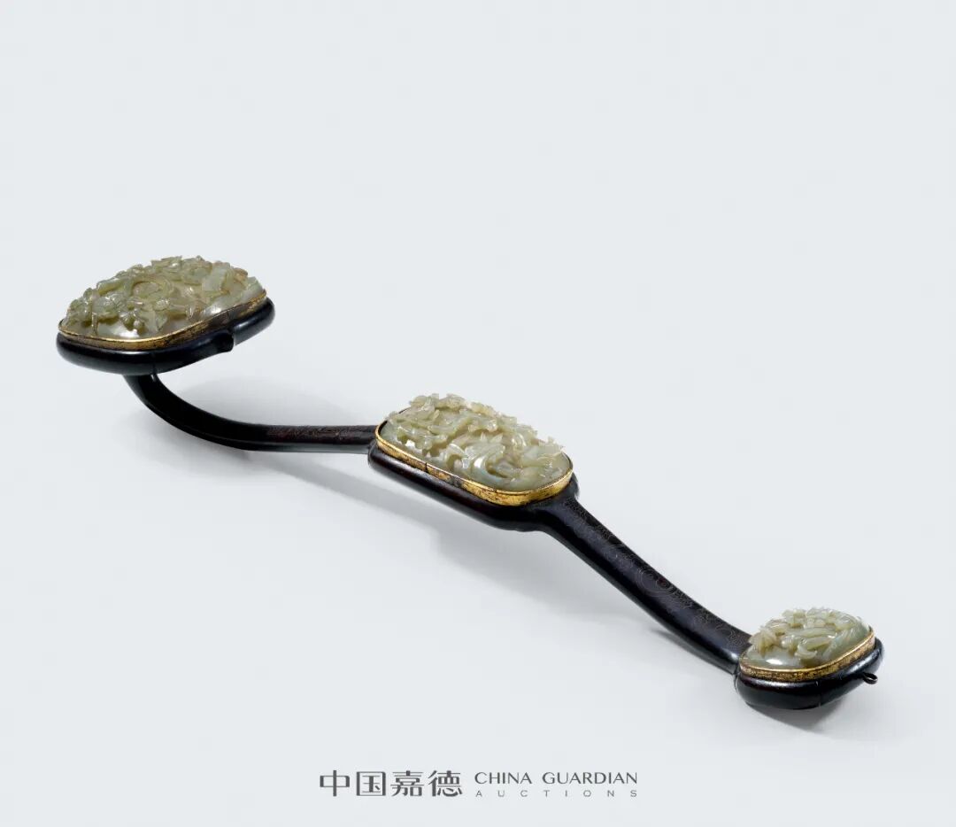 清乾隆时期因尚古而发展出来的独特工艺设计创举“三镶如意”。“三镶如意”是以竹、木为主题,首、腹、尾三处镶以玉器为师,尤以装镶古玉为贵,随后为了精简用料又发展出首、尾两镶和只饰柄首的单镶如意。三镶如意的形制具有富丽精湛的艺术风格,呈现出鲜明的皇家美术特色,自此成为清代中、后期如意形制的典范。本件如意造形雍容而端庄,曲线婉转而流畅,结构严谨而和协,工艺娴熟而精湛,自上而下原镶玉雕件,色彩均衡融洽,纹饰则浑然一体,显示出对通感美学的追求,也彰显出至尊无上的皇家气息。