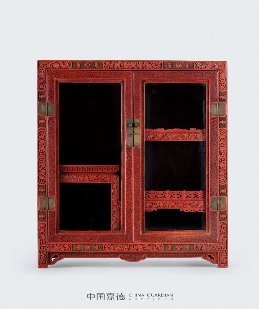 多宝柜小器大样,以清初四门大柜为祖本,缩制而成,小柜以木为胎,四角攒框,柜立式,门对开,内设架格。外朱内黑,髹以纯正大漆,四周以剔刻锦地为饰,柜门则以多层朱漆堆文,以卍字纹锦地饰边,框中镶嵌透明玻璃,柜门中间设有铜面叶;两侧面剔刻镶嵌博古图;背面以剔刻填金工艺在光洁的红漆地上,满饰吉庆纹、缠枝花卉纹、卍字纹等,花纹描绘细致。