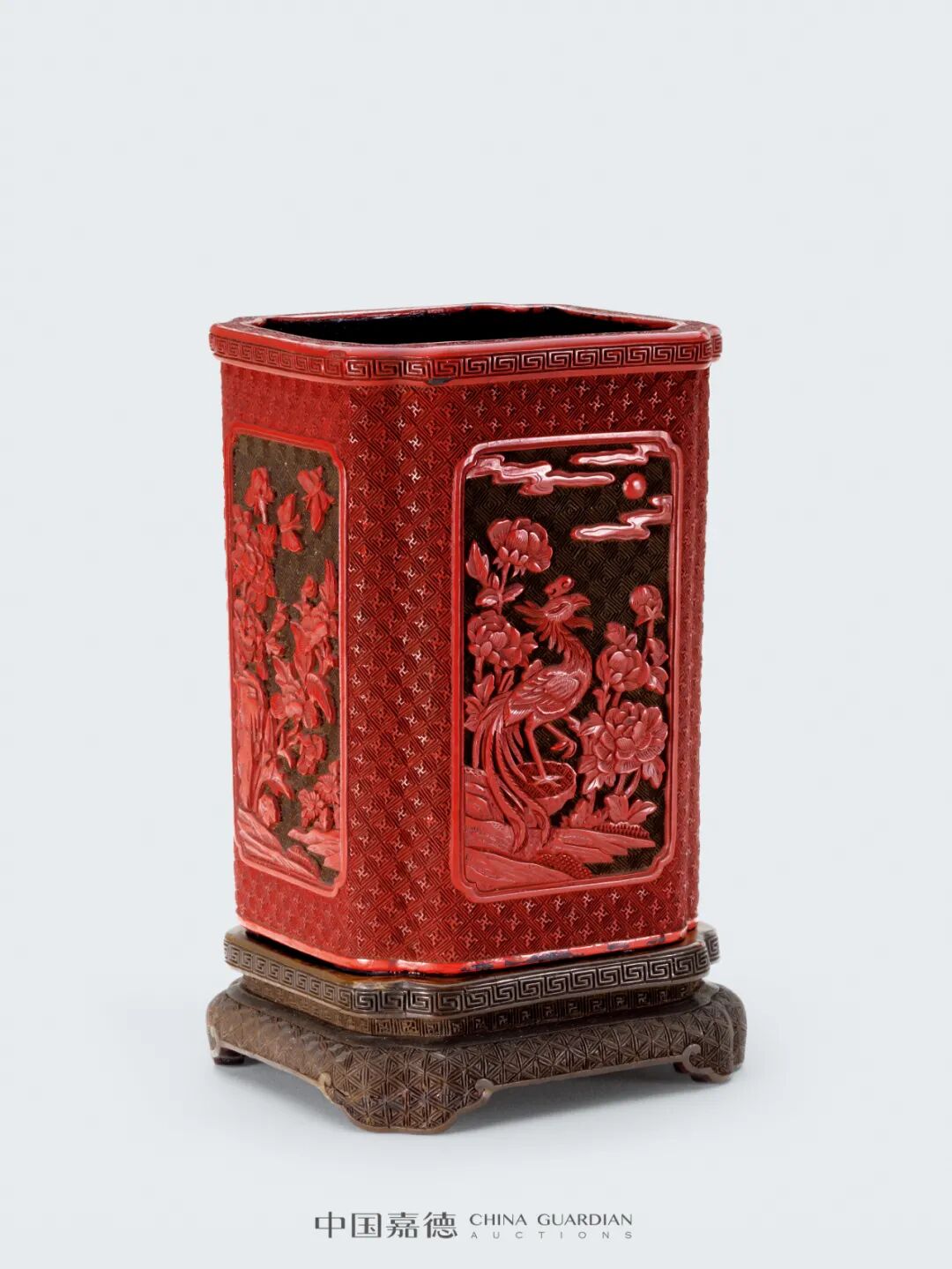经历清初短暂的混沌后,剔红雕漆一工艺在继承元明期间多元的发展在乾隆间再度兴盛。业以成熟的多样技法与新时代风格巧妙融合,加以干隆厚爱垂菁的推动下,创出超越前期的空前盛况。此件笔筒形制经典,施漆纯正,雕剔下刀有力利落,纤细自如,在周正的直壁上工整有致地剔刻描绘花鸟,更是在皇家御用的尊贵奢华之外增添了文人高士的风雅之情,难得一见,可宝可藏。