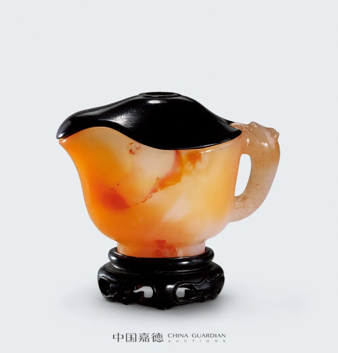 觥为盛酒器。此件玛瑙小觥杯为玛瑙雕就,器形源于商周之际青铜器,古朴华美。明清之际这一类玉器的造型丰富,宫廷造办处琢制了很多此类仿古器物。在宫廷中多用于陈设。乾隆帝好玉尚古,仅《乾隆御制文物鉴赏诗集》中,就有十五首赞美玉觥的诗篇,可见乾隆帝本人对它的追爱程度。此器材质上乘,色泽明艳,器壁薄厚均匀,抛光细腻,且带有乌木原配盖、底座,颇为难得,实属乾隆时期仿古作品中的精彩之作。