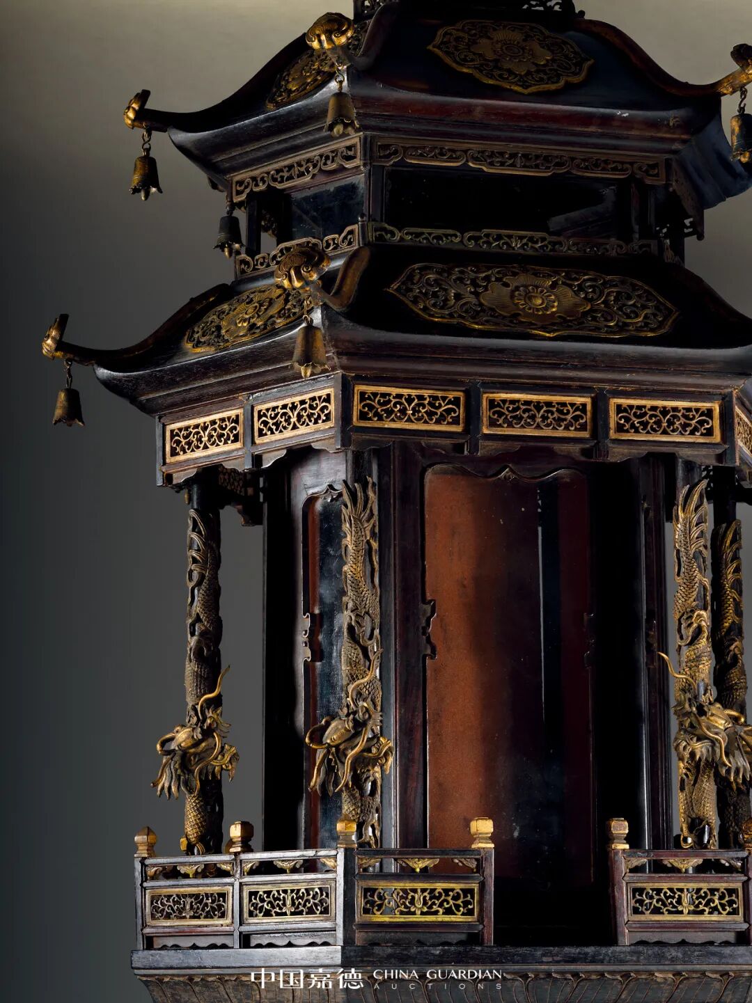 佛龛紫檀质,为重楼式,六角亭造型,典型宫廷样式。多用于陈设佛像之用,紫檀色泽黝黑,刚好和宫廷金铜佛像呼应。整体造型别致,把木雕和铜雕工艺巧妙结合,尽显皇家气派。无论从其造型、装饰风格以及木雕层次分明,与当时玉雕工艺极其相类的特点,均集中体现了乾隆朝的典型特征,既体现了清代皇室奉佛之诚悃,也反映出帝王后妃对于世寿绵长的希冀与向往。