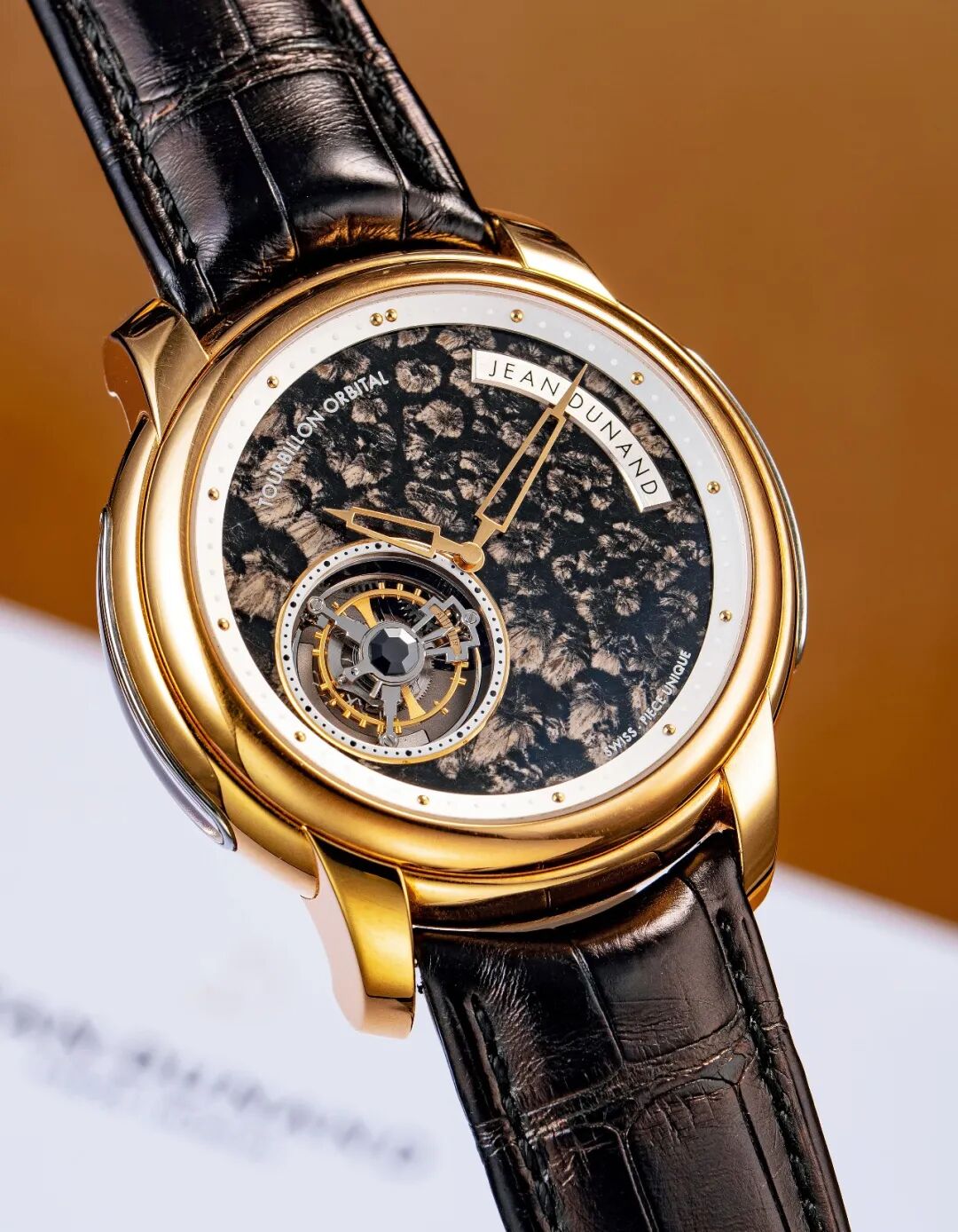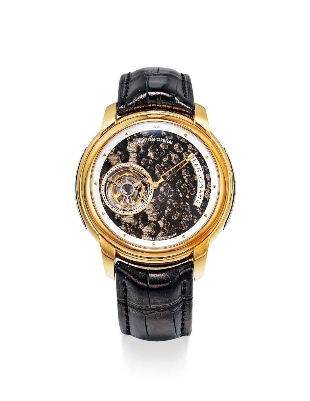 獨一無二、精美罕見,18K 金飛行陀飛輪機械腕錶,備動力儲存、月相顯示及化石錶盤,「Tourbillon Oobital」,型號 10 1894,年份約 2012,附原廠證書及錶盒