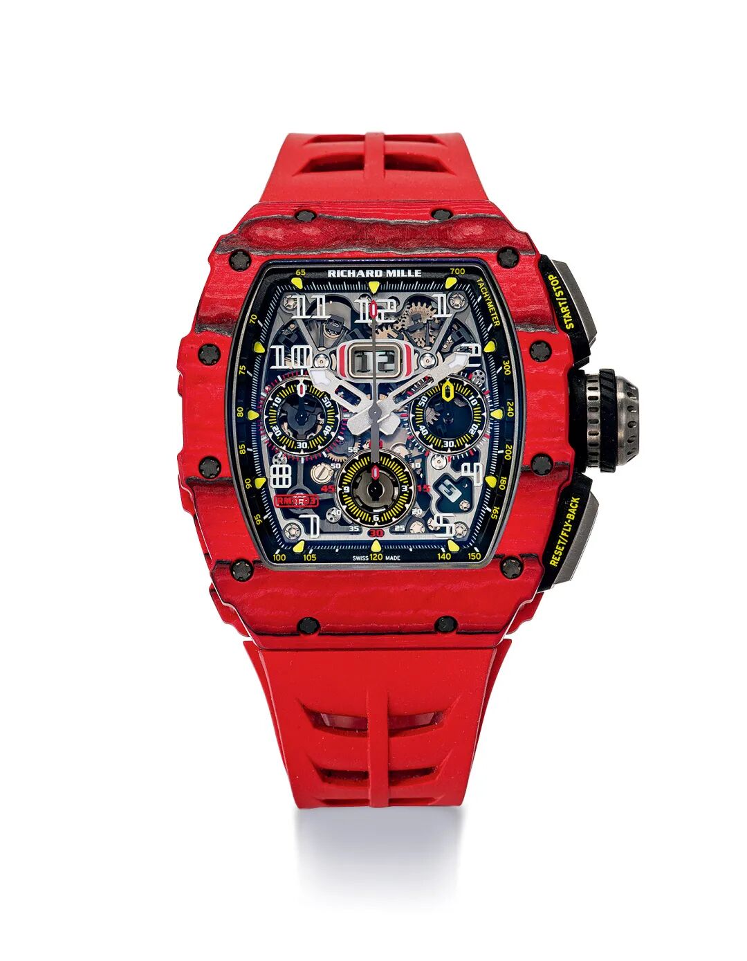 精美吸引,紅色 TPT 石英及碳纖維酒桶形鏤空自動飛返計時碼錶,備小秒針、日期及月份顯示,型號 RM 11-03 FQ TPT,年份約 2019,附原廠證書及錶盒