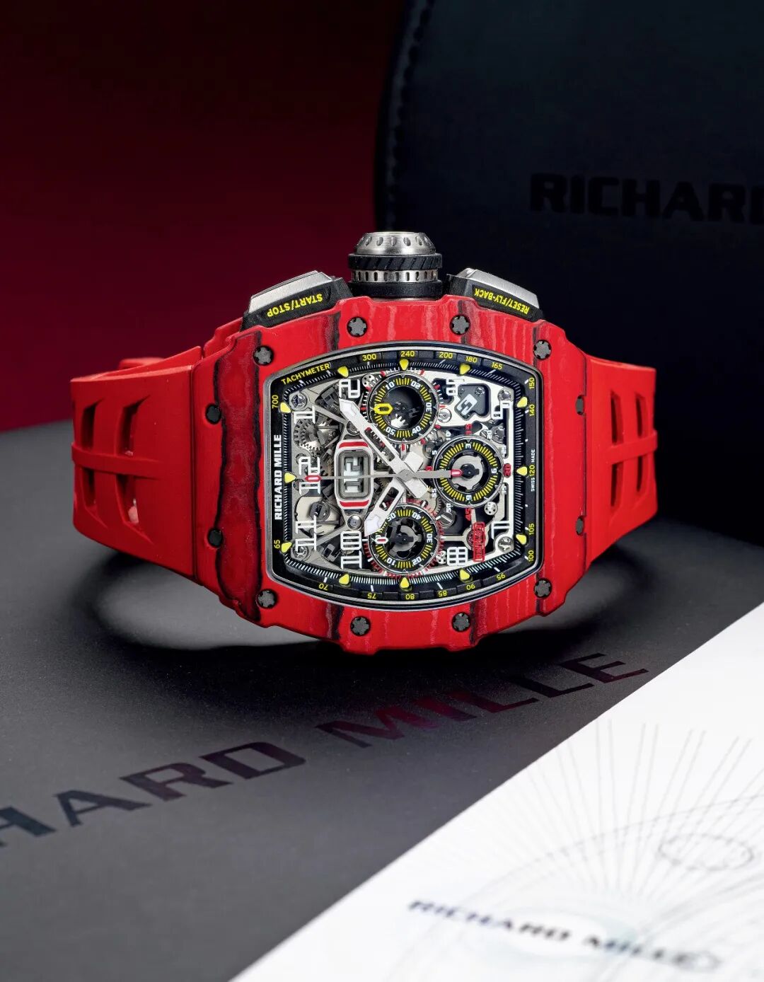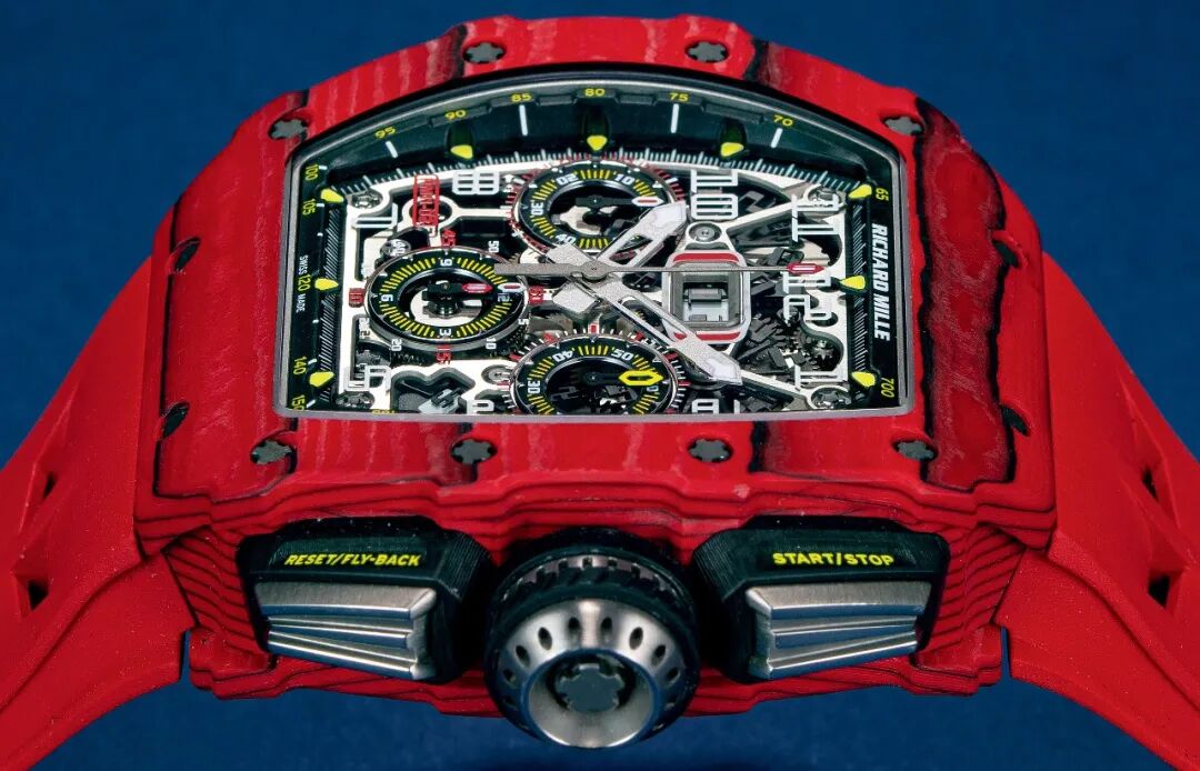 腕錶搭載了 RMAC3 自動上弦機芯,鏤空錶面上的複雜機械結構清晰易見,華麗的斜切邊緣給予腕錶深邃的質感,彩色的飛返計時器錶盤和秒針顯示窗圍繞著中央時間顯示,具有濃濃的賽車元素。加上特大的日期顯示,這「腕錶上的一級方程式」絕對為佩戴者帶來一場視覺盛宴。創新的設計讓里查德米爾在眾多鐘錶品牌脫穎而出,成為了不容忽視的頂尖革新鐘錶製造商。