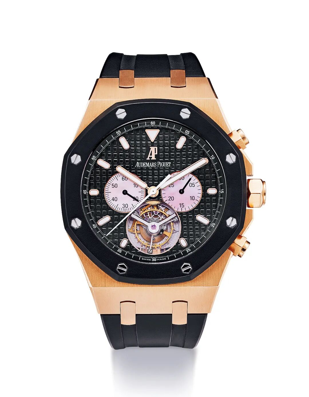 本拍品型號 26351OK.OO.D002CA.01 採用了相當具有質感的 18K 玫瑰金材質,黑色格紋錶面配以計時秒針和刻度,增加了不少層次感。另外,兩個計時小錶盤以粉色珍珠貝母點綴,散發著絢爛的夢幻光澤。腕錶搭載了 2889 手動上弦機芯,支援了陀飛輪和計時兩項複雜功能,時計具有卓越的穩定性,舉世讚譽。透過精湛的半鏤空設計,得以透視隨時間轉動的一分鐘陀飛輪裝置,愛彼兼顧了最佳性能與美觀造型,創造了這枚極具現代感與貴氣的氣派腕錶。