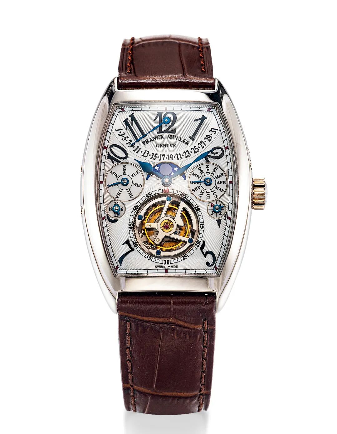 精美,白金酒桶形萬年曆陀飛輪機械腕錶,備逆跳日期、星期、月份、閏年、月相及 24 小時顯示,「Cintrée Curvex」,型號 7880 T QP,年份約 2007,附原廠證書及錶盒