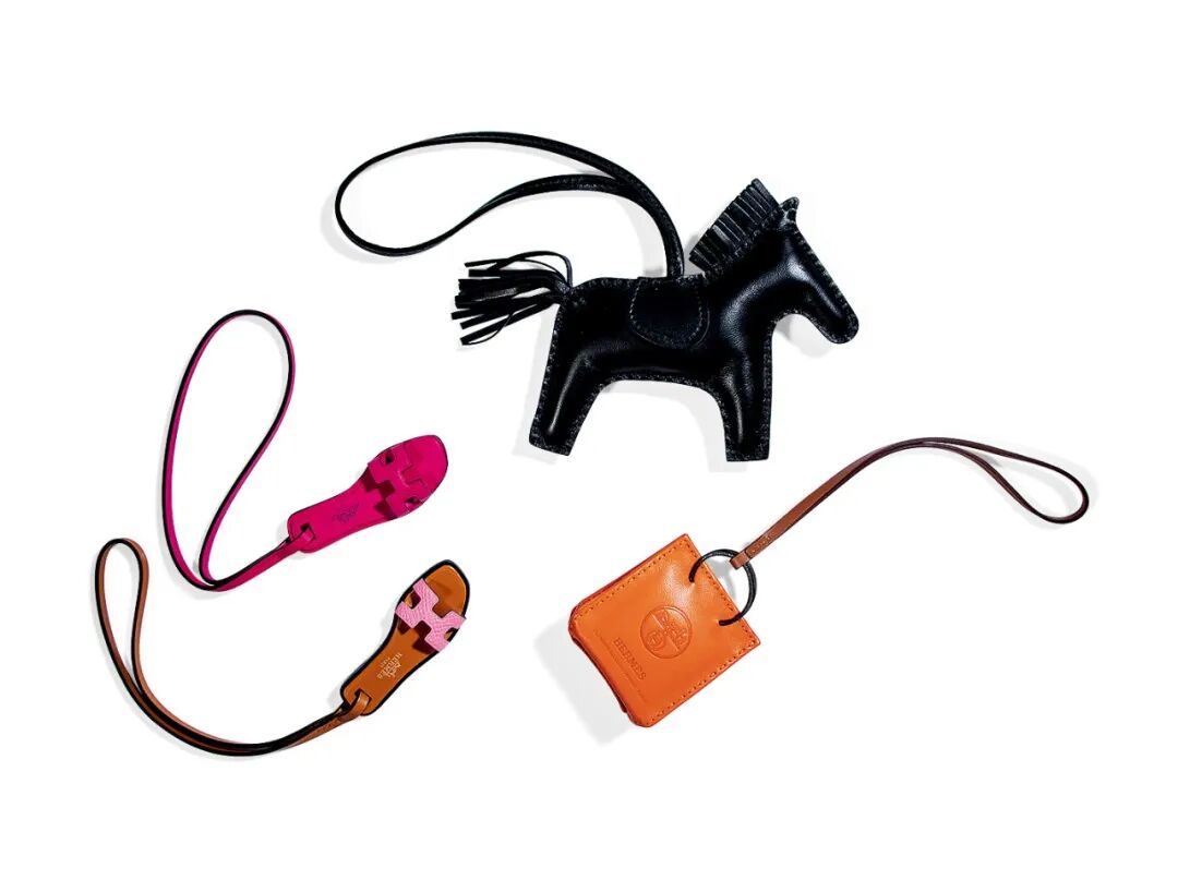 兩件 EPSOM 牛皮 ORAN NANO 拖鞋掛飾 & 橙色 SWIFT 牛皮迷你購物袋掛飾 & 黑色 SWIFT 牛皮 RODEO 小馬掛飾