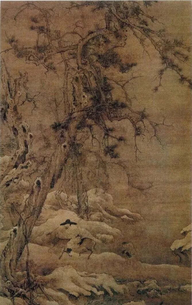 画面只有近景和中景,远景则掩于古松之后,未着一笔,却气象萧瑟,境界幽深。在刻意营造的荒寒冷寂中,却有嫩枝环绕苍松,严寒之下仿佛孕育着无限生机。