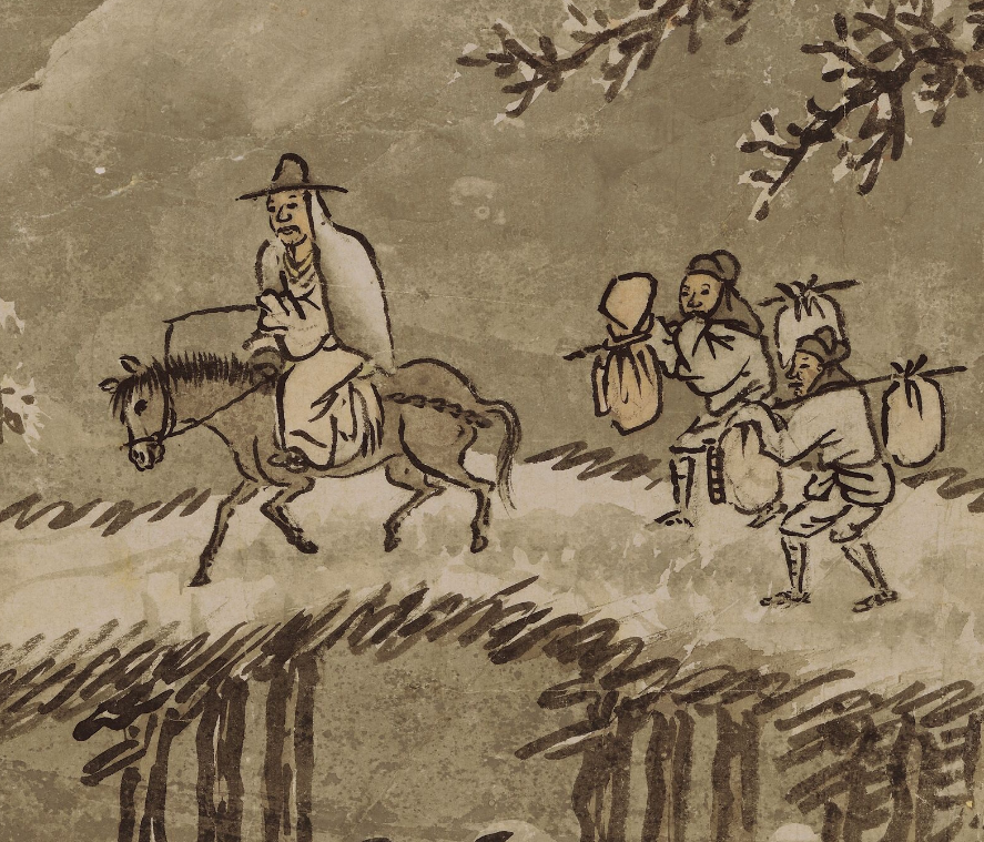 《驴背吟诗图》,画中一老翁骑驴缓缓而过,仿佛正在吟哦诗句,悠然雅适,似乎听到“得得”的蹄声从画里传出。整幅画以意笔而成,构图简练,笔墨生动鲜活,诗意盎然。