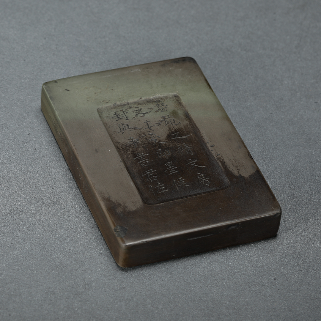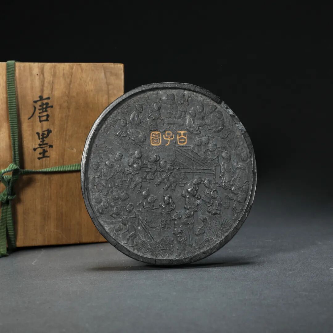 说明:带原盒。墨呈圆形,双面起框,模印民间流行的传统题材“百子图”,众小儿体态各异,三两成群,或坐地弈戏、识字、凭栏远眺,或玩傀儡,或据水戏水、对弈、捞鱼,或聊天、斗蟋蟀、玩鸟、耍杆,丰富多彩,天真活泼,热闹欢愉。儿童与庭院精致满饰墨面,构图饱满,层次分明,排列疏密有致,画面动静结合,刻工细腻,毫髪不爽,充分展现了高超的制墨刻模之技艺。