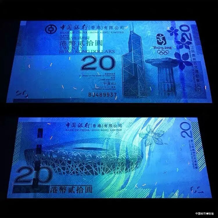2008年中国银行(香港)发行香港20元奥运纪念钞设计主题是宣传奥林匹克宗旨及北京2008年奥运会的理念。钞票正面主景为古代奥林匹克运动发源地的遗址建筑图案、北京2008年奥运会会徽及香港中银大厦图案。背面主景是北京奥运会主场馆“鸟巢”。钞票多处采用北京2008年奥运会形象图案、文字及象征运动的多色图形,以刚与柔、动与静的表现手法,体现古今人类文明在时空上的融合、奥林匹克精神的传承与发展,充分反映香港市民期盼和支持北京奥运会的情怀。