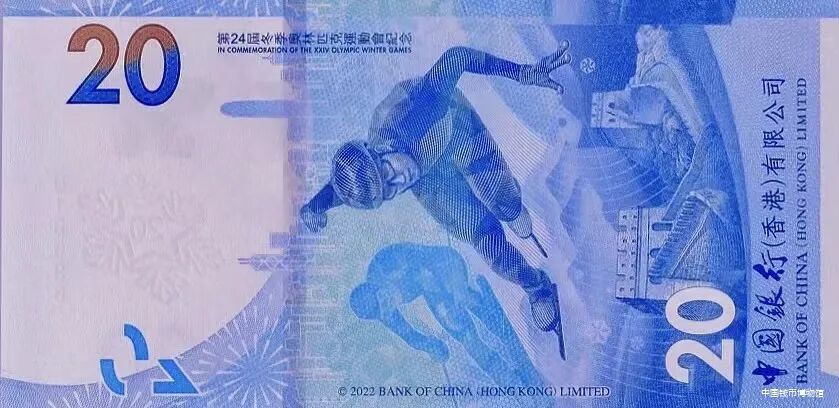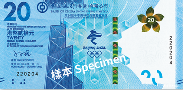 为庆祝和纪念北京2022年冬奥会,中国银行(香港)发行20元面值港币的北京2022年冬奥会纪念钞票。该钞以唐诗写月名句“天涯共此时”为设计理念,寓意香港市民心连冬奥,情系祖国。钞票正面以北京2022年冬奥会会徽及香港中银大厦为主景,并以展现冬奥会特点的冰雪图案作衬托。配以在明月下的香港维多利亚港剪影作背景,两者之间以冰雪运动员在滑道上的飒飒英姿相连,表达“海上生明月,天涯共此时”的含义,象征香港市民对北京2022年冬奥会的祝福及支持。