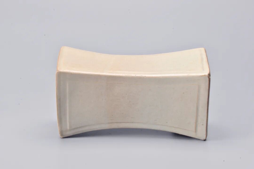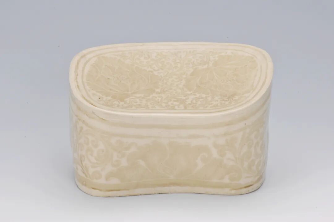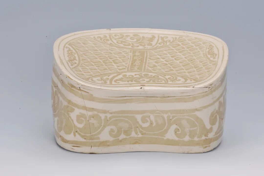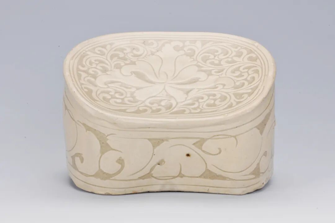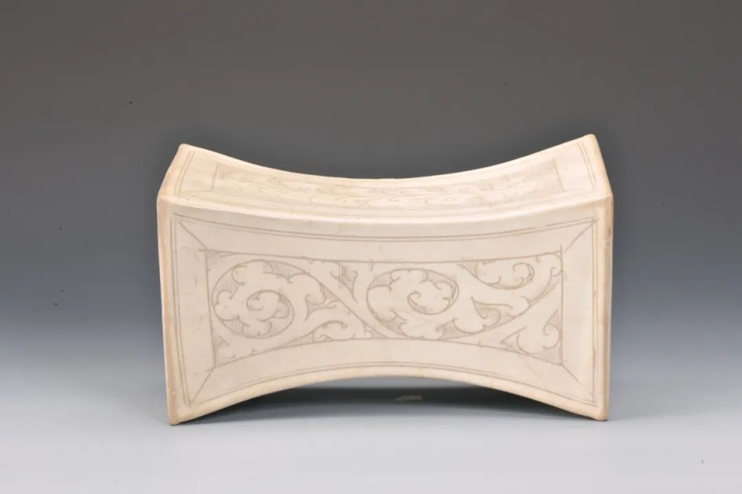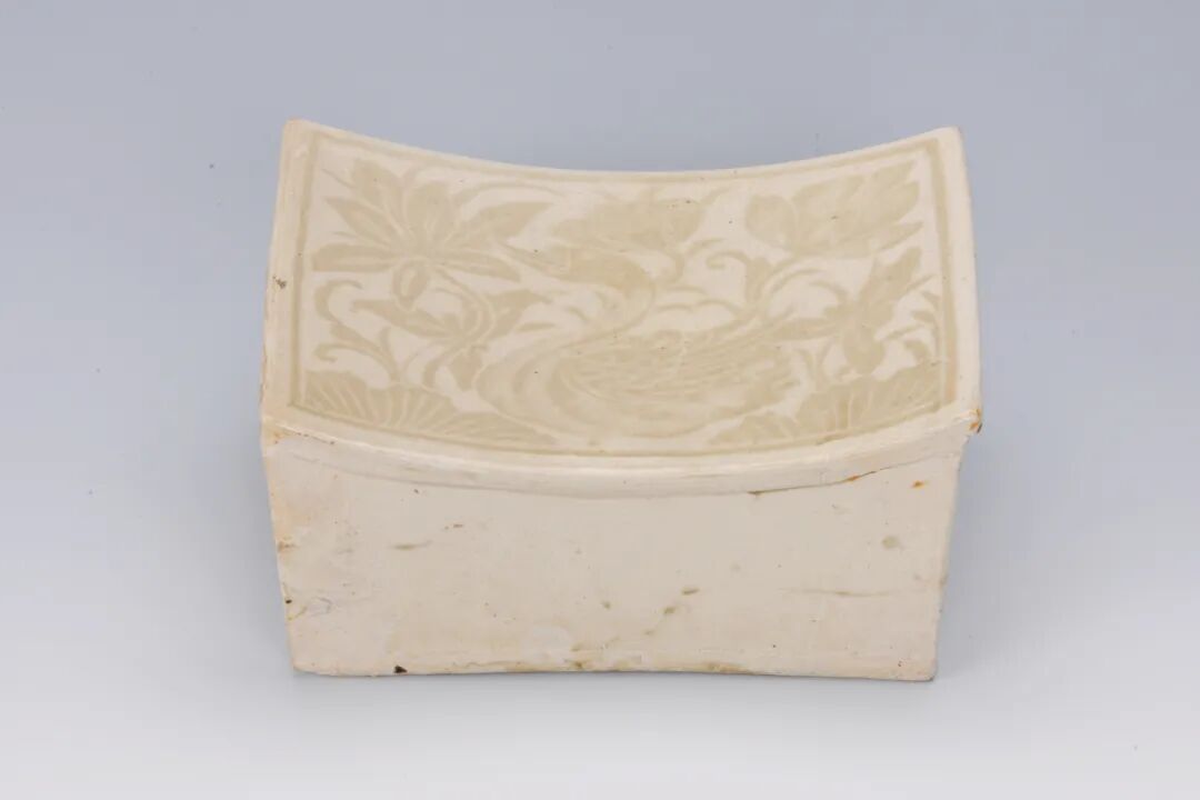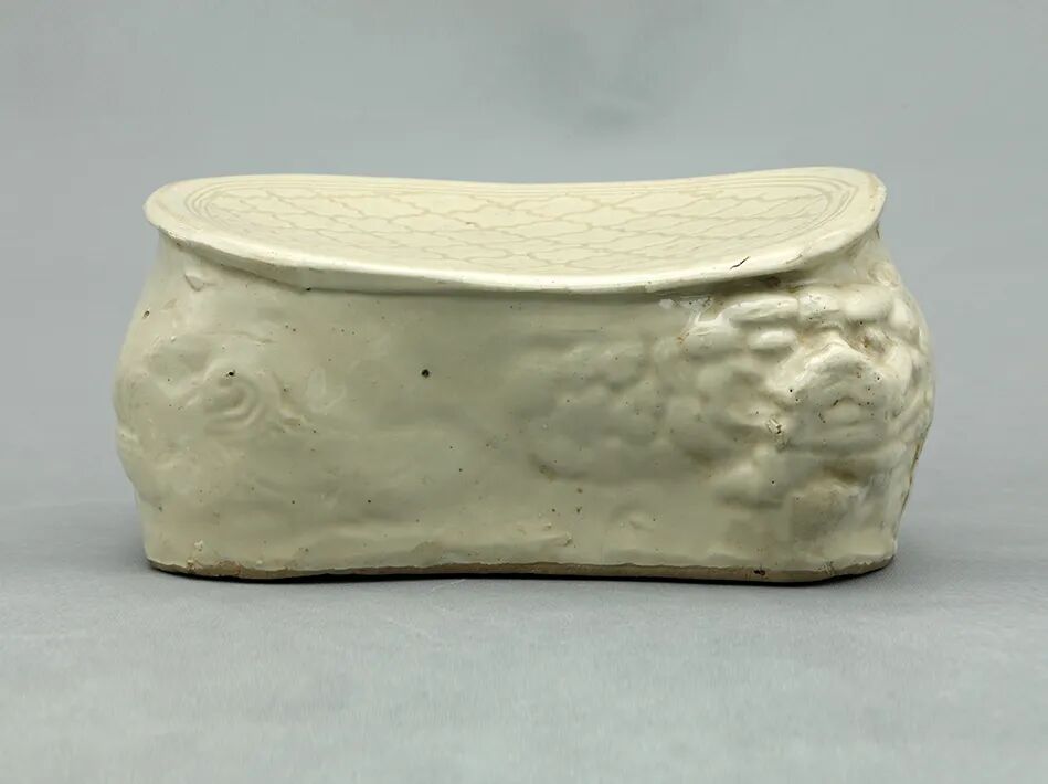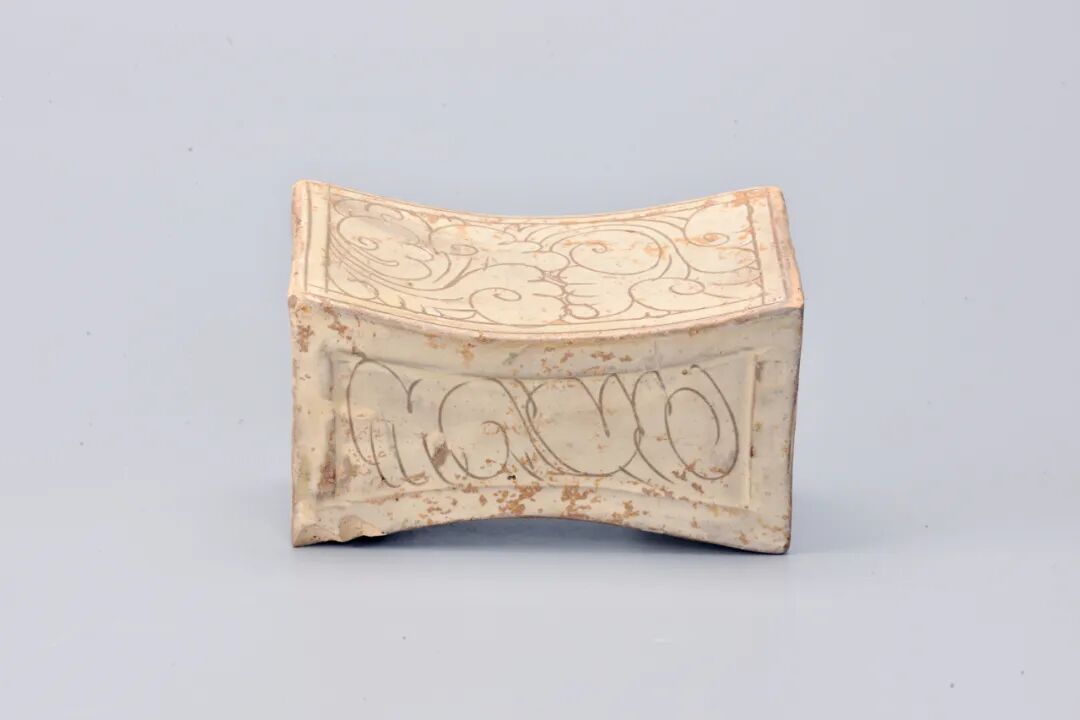 束腰形瓷枕最早见于唐末五代,宋金时期较为流行,元代也可见,在清代民国乃至二十世纪五六十年代仍有制作。这一形制的陶瓷枕也是定窑及定窑系窑常见的陶瓷枕类型之一,在此后的历史长河中经久不衰。北宋后很多瓷窑都烧制具有定窑风格或某些特征的瓷器,形成了以定窑为中心的定窑系。随着宋朝南迁,出现了与河北定窑相对的“南定窑”。定窑系涵盖了河北邢窑、河南鹤壁窑、山西平定窑、盂县窑、介休窑、霍县窑、阳城窑、四川彭城窑,江西吉安窑、景德镇窑等瓷窑。定窑虽然到元代的时候走向衰落,但是定窑系窑址在大江南北不断发展传承千年,炉火生生不息。