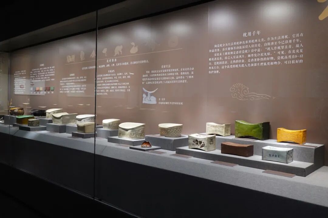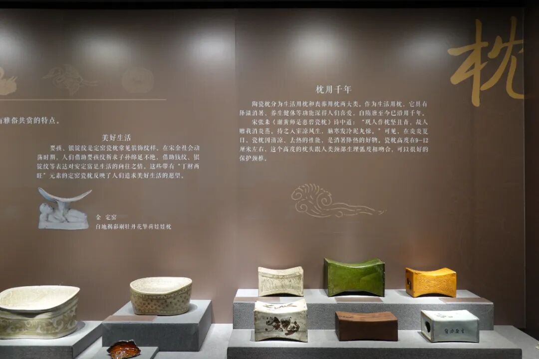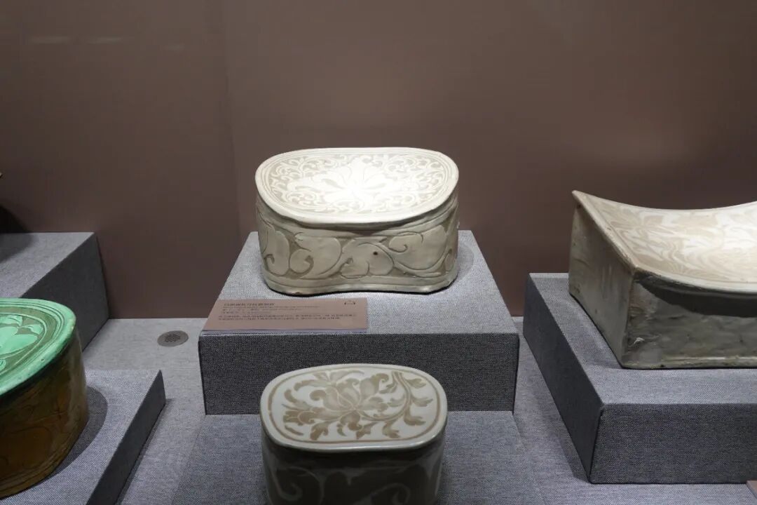 2022年6月21日,微展览“定窑花枕”在南越王博物院王墓展区开幕,共展出南越王博物院藏枕类文物17件,包括一级文物8件、三级文物2件,其中包括近年新征集、首次展出的白釉剔花凤穿花卉纹腰形枕、白地褐彩剔银锭纹“长命富贵”铭腰形枕、白地褐彩剔牡丹纹腰形枕、绿釉划水波纹束腰形枕、黄釉缠枝花地印摩羯纹束腰形枕等8件珍贵文物。