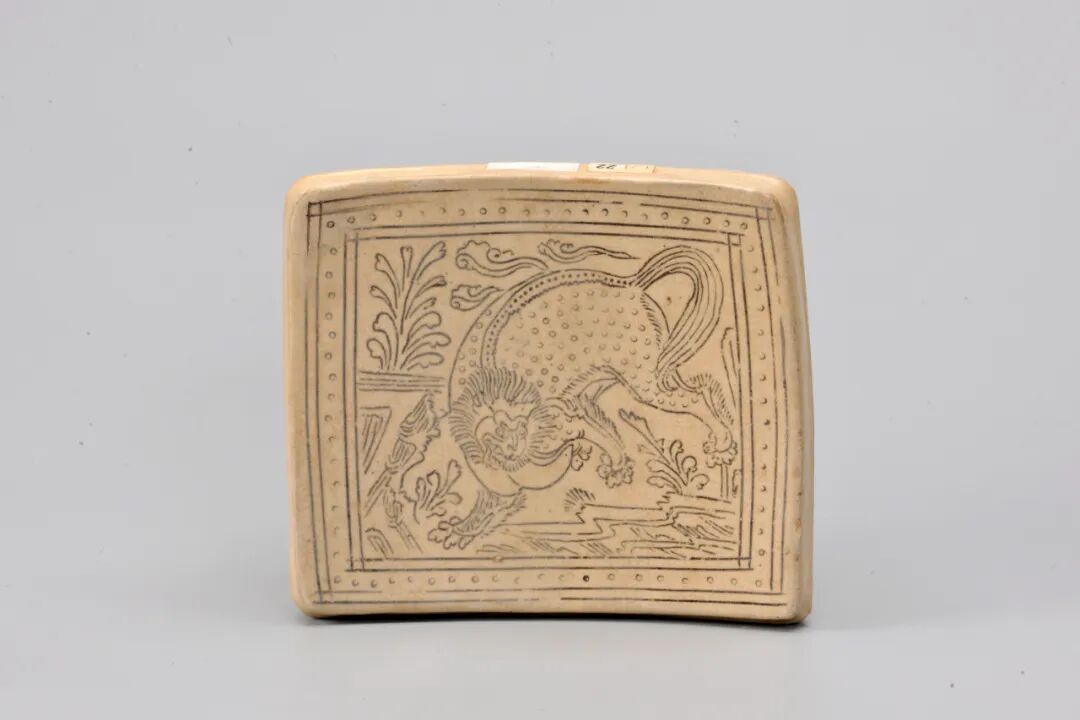 定窑瓷枕上的动物纹饰千姿百态包括狮子、龙凤、飞禽、游鱼等。这些纹饰常将划花、印花、绘花、模印、剔花等技法组合使用,使之成为陶瓷艺术珍品。