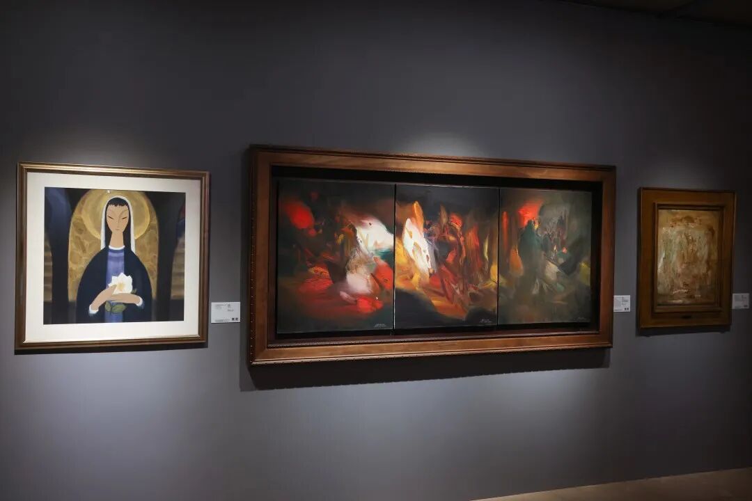 1979年的《旭日千里》,是朱德群一以貫之,以油彩揮灑而出中國山水意境的抽象之作,此作的三聯式構圖,呼應著中國橫卷山水營造而出的平遠景致;而作品題名,同樣深受中國山水畫的影響。從《旭日千里》到《宇宙洪荒》、《初晴》、《仲冬》、《大地甦生》…等其它作品,就是朱德群取法東方山水的題名精神。《旭日千里》以那抹奪目的亮光,以及火紅的色彩最引人注目,成為作品的基調,加上光源、明暗對比,表現出時間的脈動。同時,藝術家讓光線不再是單一方向,而是有著多重的折射與反光,畫面的彩度與飽和度更為完滿,創作出非靜止的畫面動態感;而朱德群標誌性的線條筆觸,已經不再是明顯的骨幹墨意,而是潛移默化的進入色彩斑斕的千里之地。