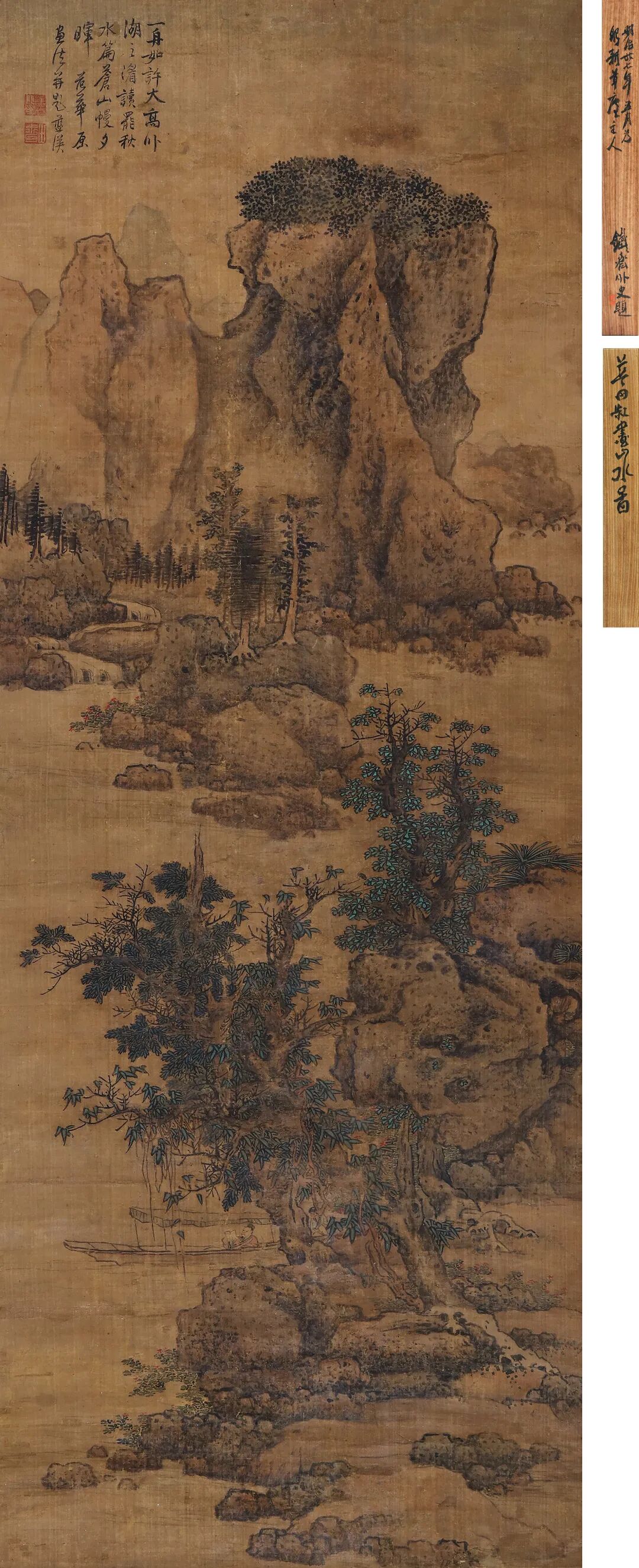 藍瑛的仿古能力雄厚。此軸取范寬筆意,更多的是融入了自己獨特的風格。圖中所繪一江兩岸。遠處山峰所采短筆作皴,部分峰頂綴有密苔。近處岸上,群樹環抱,樹葉用夾葉所點綴。樹後一葉扁舟正徐徐駛過。一高士悠然自得的讀著書卷,船後有一書童陪伴。藍瑛的繪畫匯集了歷代名跡之精華,並融入了各地山川之靈性。其繪畫水平爐火純青,繼承發揚了傳統繪畫的筆墨和意境,可謂文人逸趣的畫家。