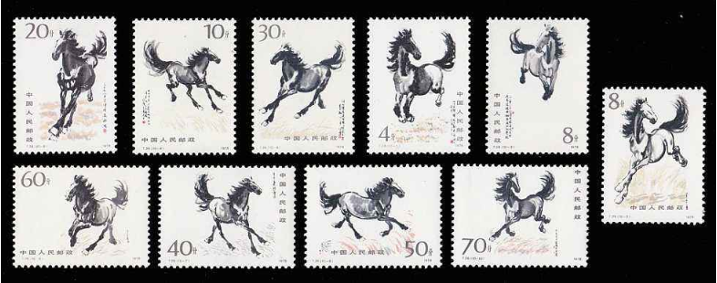 T28《奔马》,称得上是气势恢宏的大套票,因其存世量少,收藏价值更高。邮票画面以白色衬底,只是用寥寥几笔略微勾勒出十匹英姿飒爽、形态各异的骏马在草地上纵横驰骋,雄姿英发,蔚为壮观: