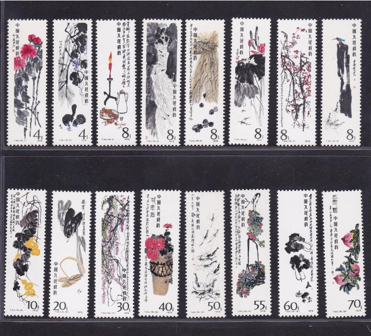 T44《齐白石作品选》,1980年发行,全套共16枚,发行量仅为200万。在新中国邮票中,独一无二: