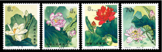 T54《荷花》,1980年发行,邮票设计家陈晓聪先生设计,是在原画著名工笔重彩花鸟画家俞致贞女士和她的老伴画家刘力上先生创作基础上共同完成的。