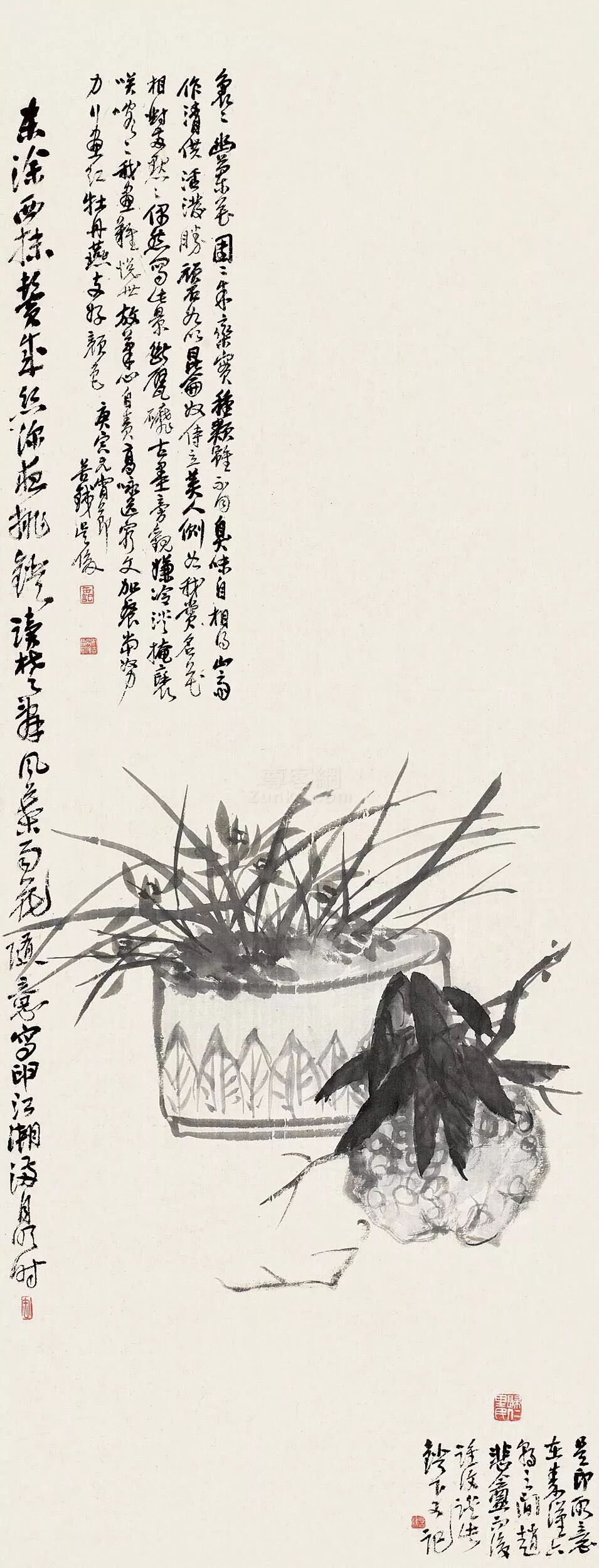 大写意是一种天才。简言之,就是人和天地自然的合作。在作画过程中,随时把天地、时间、温度、气压、湿度、声音、光线、季节,包括风雨,所有生存环境中能感受到的偶然巧合充分利用,主观地、主动地和被动地将可操作和不可操作的结合起来,突然出现神来之笔,超出人力所能把握的效果,是为天才作品。