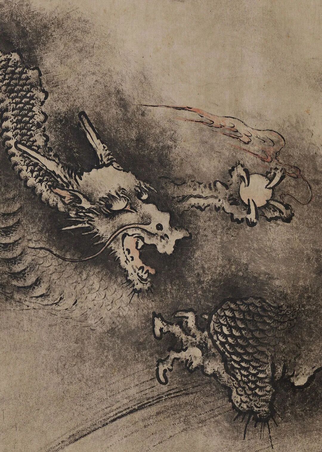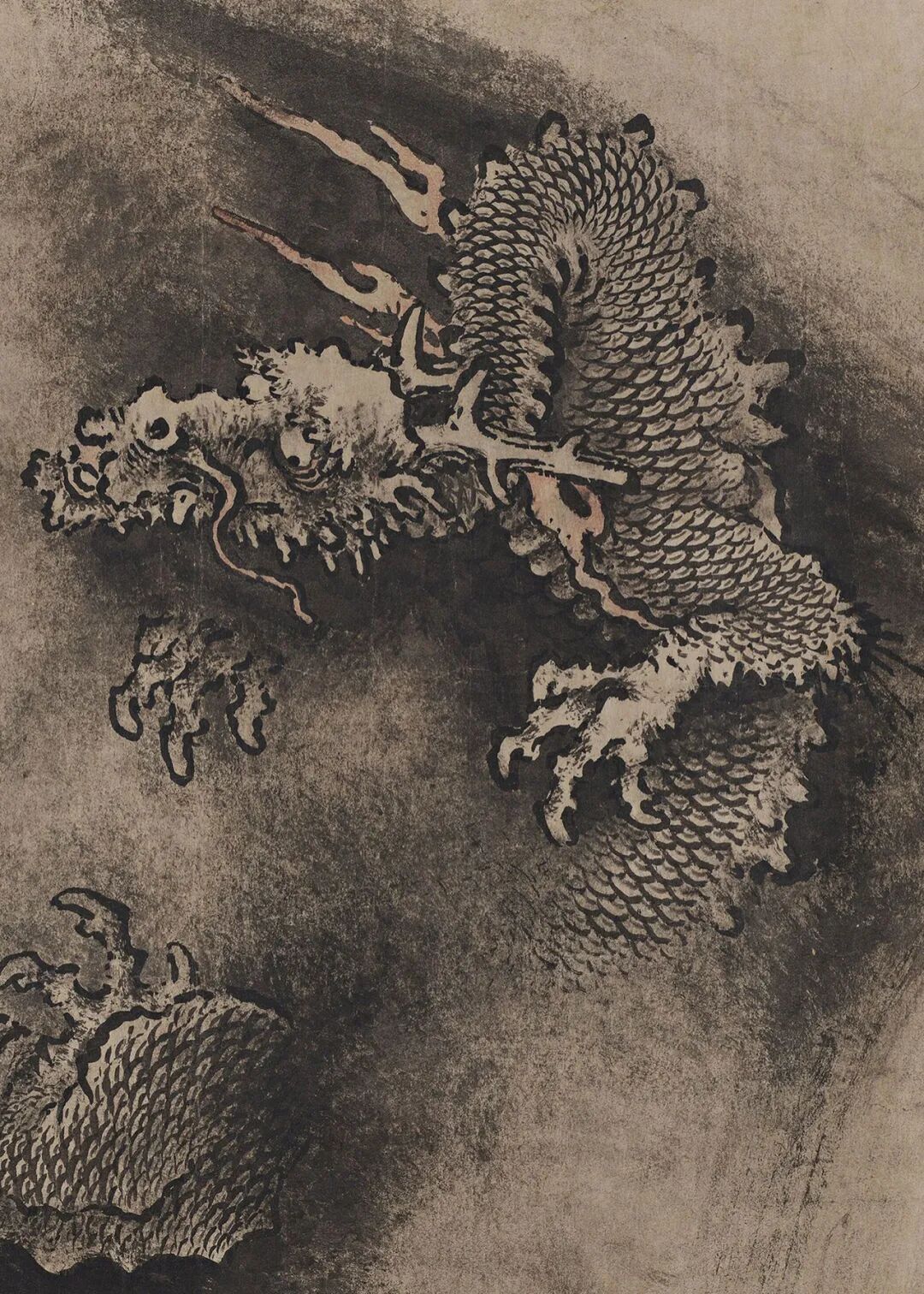 陈容《九龙图》,纸本墨笔淡设色,纵46.3厘米,横1092.4厘米,目前藏于美国波士顿博物馆。其中描绘了九条形态各异的龙,或攀伏山岩之上,怒日圆睁;或游行于云空之中,雷电云雾掩映;或龙戏水珠、波涛汹涌;或雌雄相待,欲追欲逐;或架势搏斗等等,将龙的种种神态情势,刻画得非常生动。