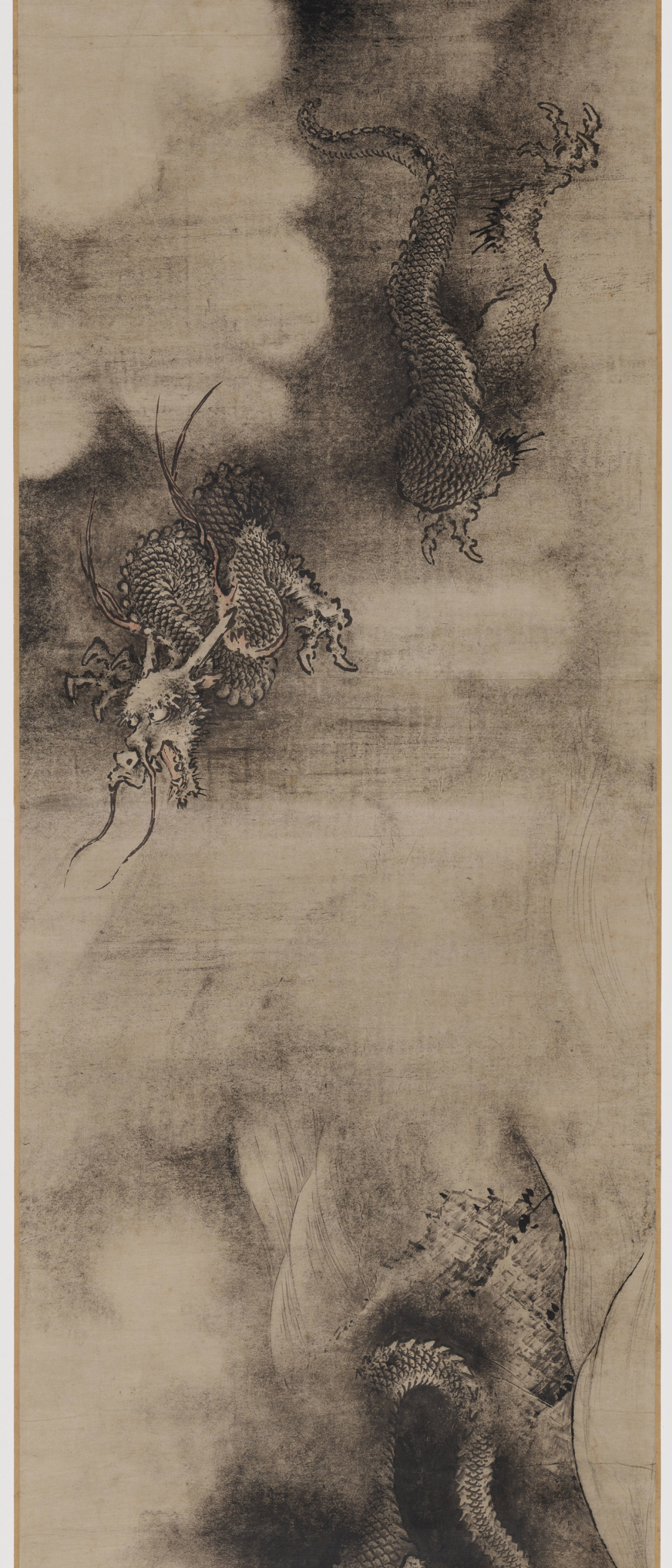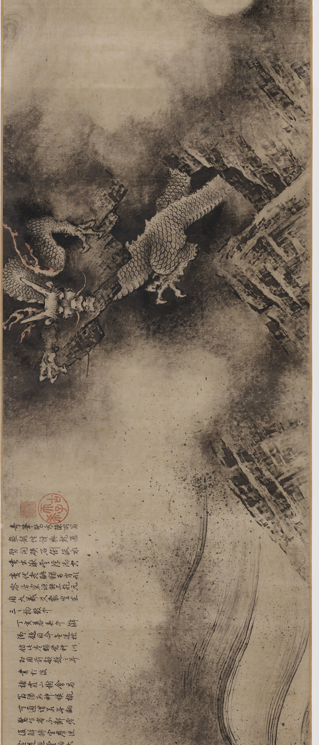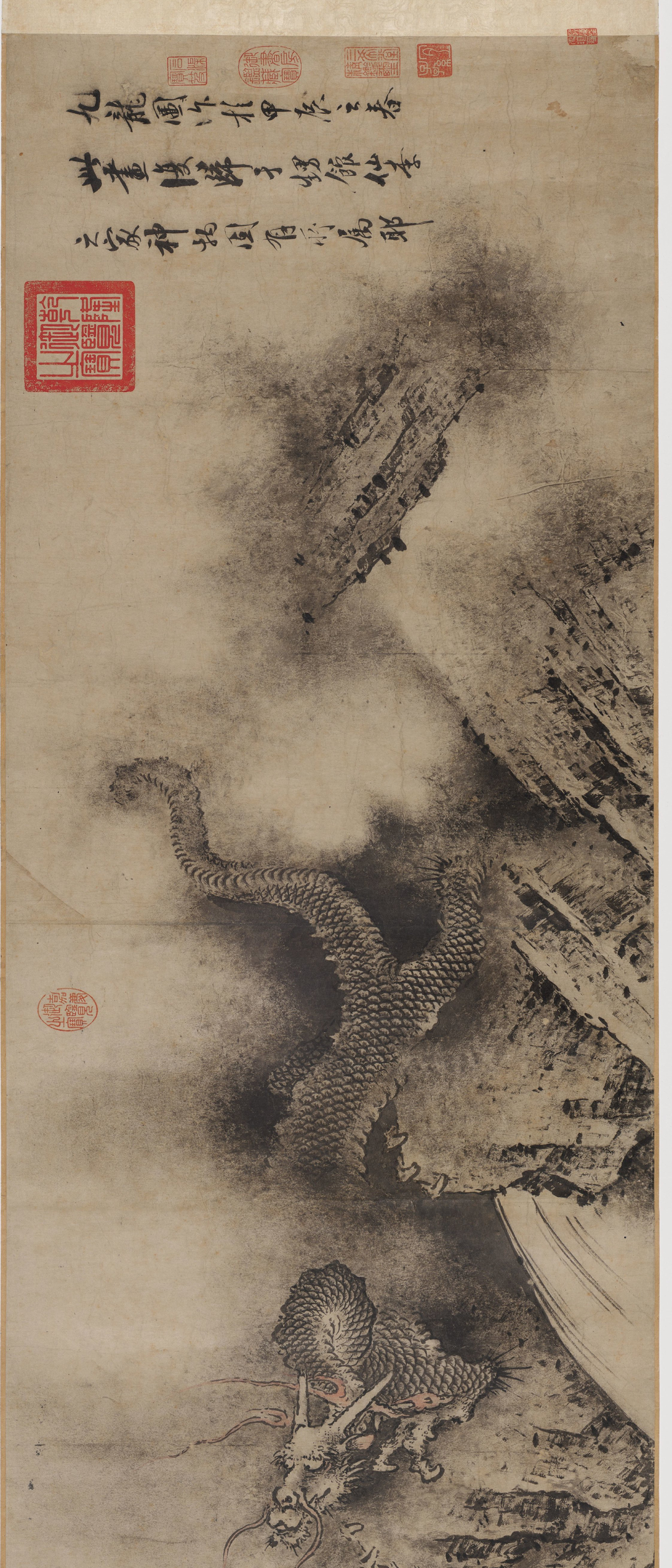 陈容,容生卒年不详,字公储,号所翁,福建长乐人,南宋时期著名画家。其才气过人,诗文豪放;长章巨篇,杰壮奇诡。据文献记:中年时中进士,后任莆田县主簿,其身世经历坎坷。他不仅是中国南宋后期“善画龙”的代表,亦是后人(据说包括日本)龙画的典范。《九龙图》是陈容作品中的代表作,有评论说他是开元代以后诗、书、画三位一体的先河。被誉为是“凡写中国美术史,不管是哪种观点哪种流派,都是必选之作”。陈容画龙喜欢酒后乘兴而作,用泼墨法画云水怪石,衬托出矫健遒劲,追逐纠结,出没隐现的群龙,用墨沉厚,笔势雄健老辣,具有很强的动态、实体感和神秘气氛。后人形容他的作品“云蒸雨飞、天垂海立、腾骧夭矫、幽怪潜见”。在陈容之前,龙的形象到了宋代几乎已成定式,《宣和画谱》列有『龙鱼门』。而至陈容时,绘画正处于由院体画向文人画转型的过程中,陈容正是这一时期的文人画家的代表,其关于龙的艺术创作也正处于突破定式的转型之中。《图绘宝鉴》说他『善画龙,得变化之意。泼墨成云,噀水成雾。醉余大叫,脱巾濡墨,信手涂抹,然后以笔成之。或全体,或一臂一首,隐约而不可名状者,曾不经意而得,皆神妙宝祐间名重一时,垂老笔力简易精妙,绛色者可并董羽,往往赝本亦托以传』。陈容《九龙图》,纸本墨笔淡设色,纵46.3厘米,横1092.4厘米,美国波士顿美术馆藏。卷首有作者自题:『《九龙图》作于甲辰之春。此画复归于甥馆仙李之家,神物固有所属耶?』一般认为甲辰为南宋淳祐四年(1244)。画中的龙变幻多端,姿态各异,九条龙在险山云雾和波涛汹涌之中,或翻腾,或逃遁,或决斗,或小憩。第一条龙紧紧抓住巨石,翘首而待;第二条龙与雾气相互缠绕,回眸望向第一龙;第三条龙匍匐岩上,目光炯炯,斜视右方,四爪乍起凌驾于大石,神态凌厉;第四条龙被巨浪卷入猛烈的漩涡中,目光狰狞;第五条龙腾于半空与第六条龙作搏斗之态;第七条龙几乎被湮没于疾风骤雨之中;第八条龙则于弥漫的大雾中若隐若现,作奔走态;第九条龙伏卧山石,悠然于云水之间。龙与龙之间虚虚实实,张弛有度,饱含节奏之变化与凌人之气势。作者以白描勾线与水墨渲染相结合,以细笔勾勒全龙,龙身以稍重的墨色晕染,龙头刻画细腻,神态具显。鳞纹清晰可辨,一片片描绘工整,笔法老练而细腻,龙身以干笔皴擦表现粗糙与力量的质感,好似松柏之鳞纹。龙的变幻莫测与其无穷神力在笔墨之间进发,其以粗犷而沉稳的线条勾勒,细腻的水墨烘染出云起水涌之状,更加有力地揭示了龙的精神内涵。整幅画面的墨色渲染浓淡有致,恰如其分,干湿变化也浑然天成。宋末庄肃谓陈容『善画水龙,得变化隐显之状,罕作具体,多写龙头』;清代葛金烺则认为『所翁写龙,全龙在胸,蒙以云气于云势开合中,云腾攫盘旋之态,干湿互用,虚实相生,象物之法,不施不宜』。徐邦达将《九龙图》视作『所见所翁画最精之品』。学界从笔墨风格、款题、书法和印章等多方面判断本卷为陈容真迹。拖尾有元代董思学、张嗣成、吴全节、欧阳玄、张翥、王伯易等跋,卷中钤有清代耿昭忠及清内府鉴藏印。本图曾经清代耿昭忠、乾隆及嘉庆内府、恭亲王府递藏,经《石渠宝笈初编》《佩文斋书画谱》著录。