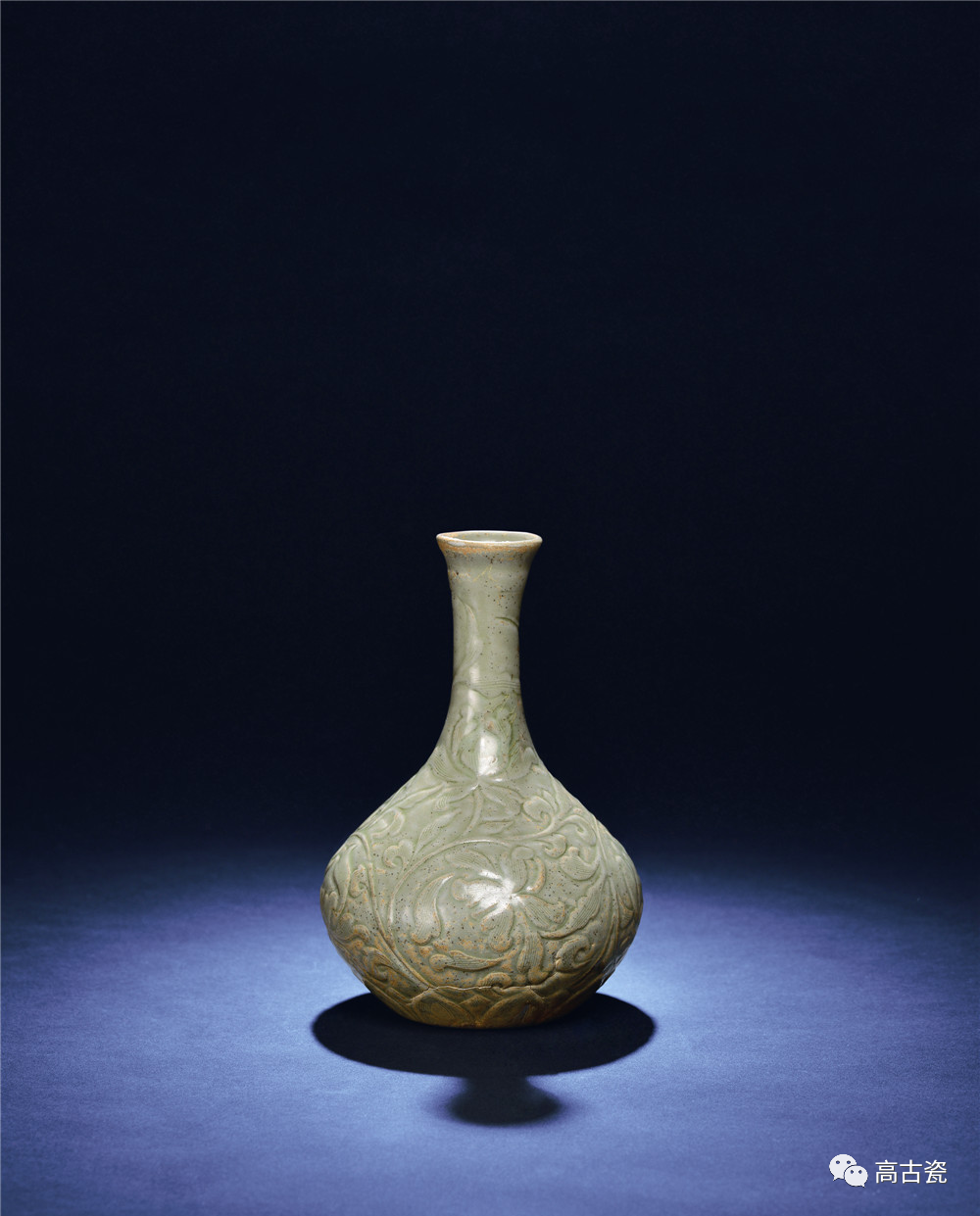 为侈口,细长颈,扁圆鼓腹,圈足。通体施青釉,刻剔缠枝莲纹。全器釉质腴润匀净如玉,缠枝花纹舒展优美。越窑是唐、五代时最著名的青瓷窑场,也称“秘色窑”。所烧青瓷代表了当时青瓷的最高水平。唐代越窑青瓷已很精美,博得当时诗人的赞美,如,颜况“越泥似玉之甄”,许浑“越甄秋水澄”,皮日休“邢人与越人,皆能造瓷器,圆似月魂堕,轻如云魄起”,陆龟蒙“九秋风露越窑开,夺得千峰翠色来”等。五代吴越时越窑瓷器已“臣庶不得用”,作为吴越王钱氏御用及贡品。徐夤有诗云:“捩翠融青瑞色新,陶成先得贡吾君,巧剜明月染春水,轻施薄冰盛绿云”。此见长颈小瓶为北宋时期越窑之佳作,越窑行至北宋,青瓷的烧造达到最高水平,名满天下。本品釉色明彻如冰,晶莹温润如玉,色泽青中带绿,类玉似冰,美轮美奂,正是北宋越窑中上佳者。