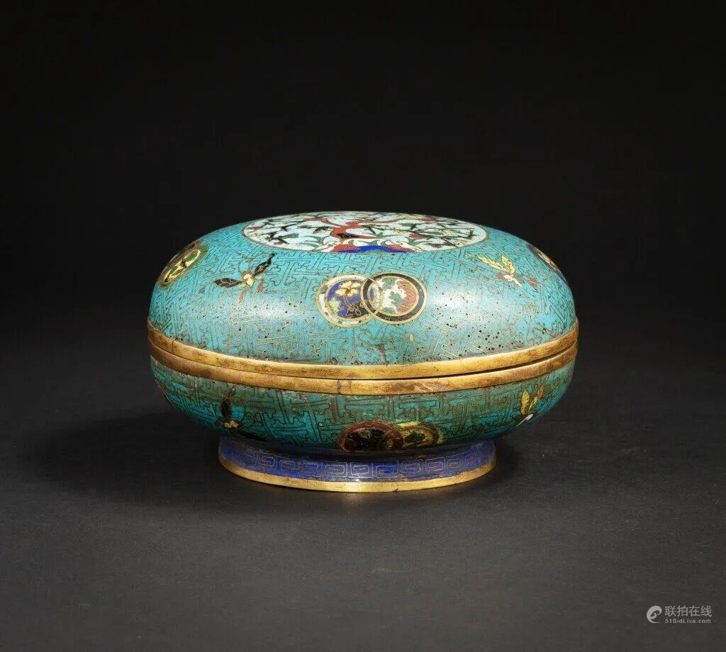 Lot 82 清十九世纪上半叶 掐丝珐琅开光梅树花开纹盖盒
