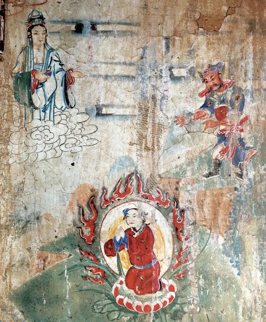 墙壁上的壁画,彷佛可以看到五百年前的历史岁月。壁画共有五铺,东西两壁分别绘制“三界诸神图”一铺,中央佛坛三尊佛像(竖三世佛)背后绘十明王像,南壁两侧相对绘“冥府图”两铺。一堂大型的水陆法会壁画。整堂壁画色彩浓郁而不失艳丽,以朱色、黄色为主,青、绿等色次之,呈现出热烈和谐的氛围,矿物质的颜色历经数百年依旧鲜艳如初,“粉壁有吴画,笔彩依旧鲜”。