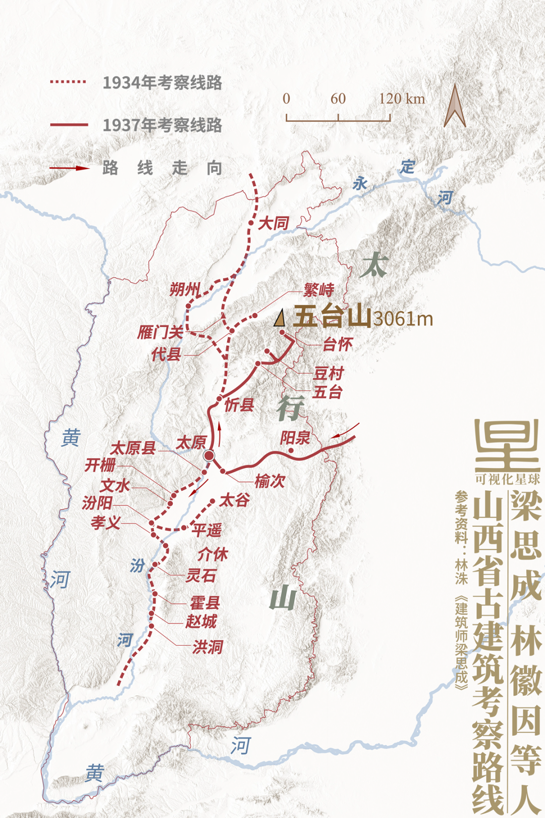 1934、1937年梁思成与林徽因、莫宗江、纪玉堂在山西省考察路线| 制图@陈志浩&张靖/可视化星球