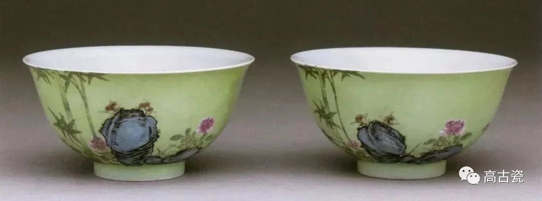 ▲清雍正 磁胎画珐琅节节长春绿地茶碗一对